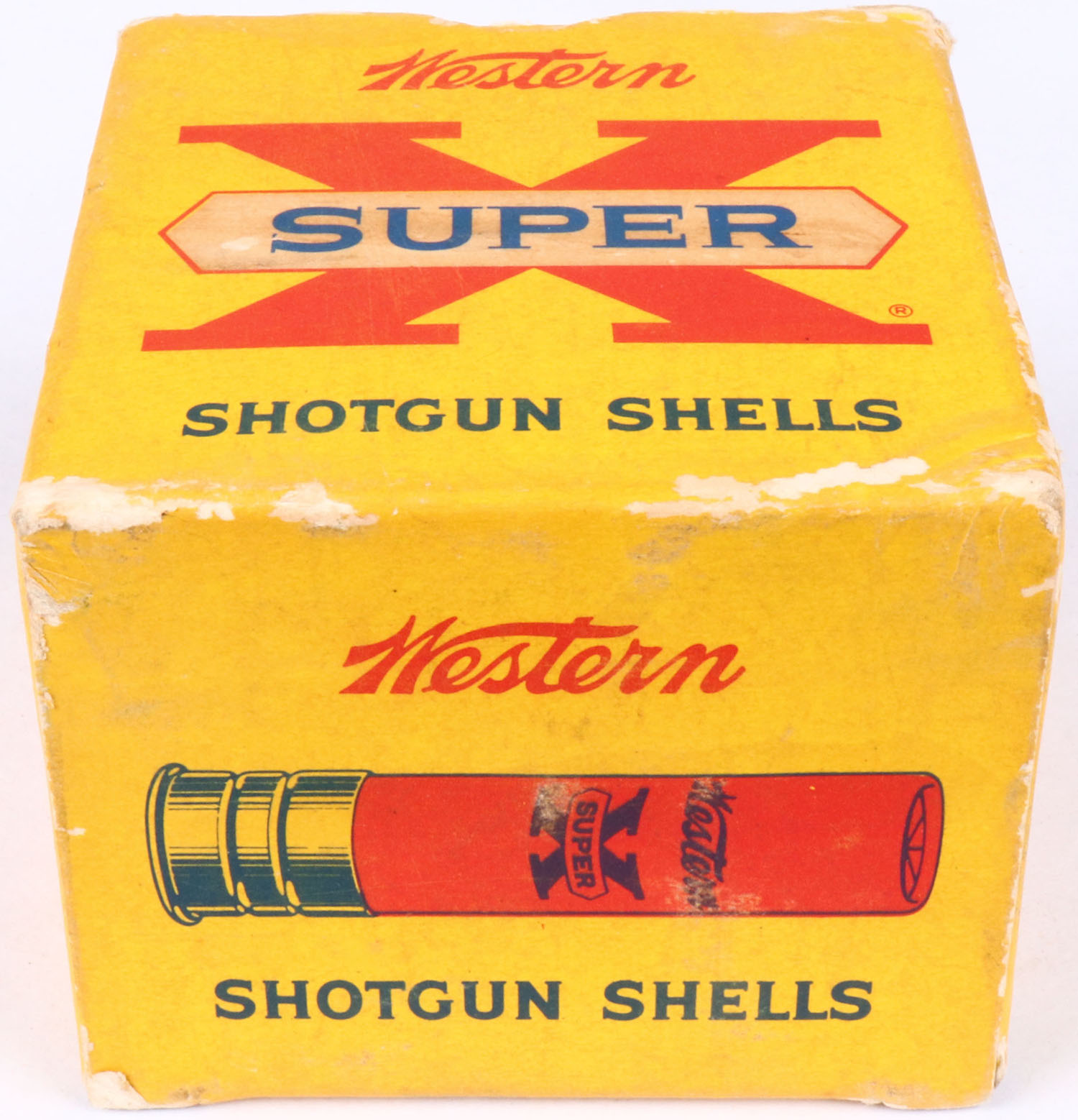 Western, Super X, 28ga., 2 3/4'', 1pc., Full, shot size 7 1/2, multi-colored box, box has age soiling & light scuffing, box is solid with very nice colors, Shells are excellent. Grade: Excellent - Value: 20 to 60