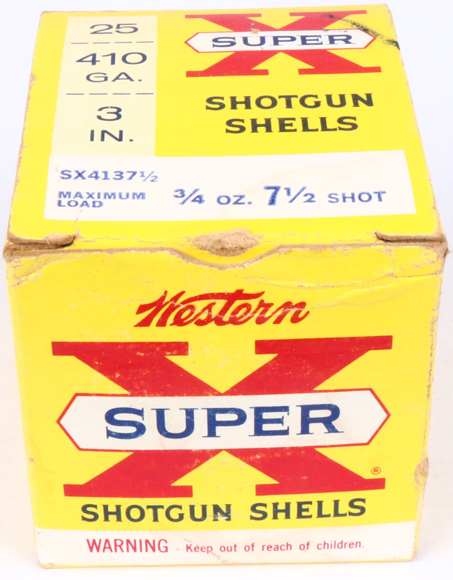 Western, Super X, 410ga., 3'', 7 1/2 Shot, 1pc., Full with 7rds being Winchester, multi-colored box, box has light scuffing & light edge wear, box is very solid with great color, shells are excellent. Grade: Excellent - Value: 20 to 60