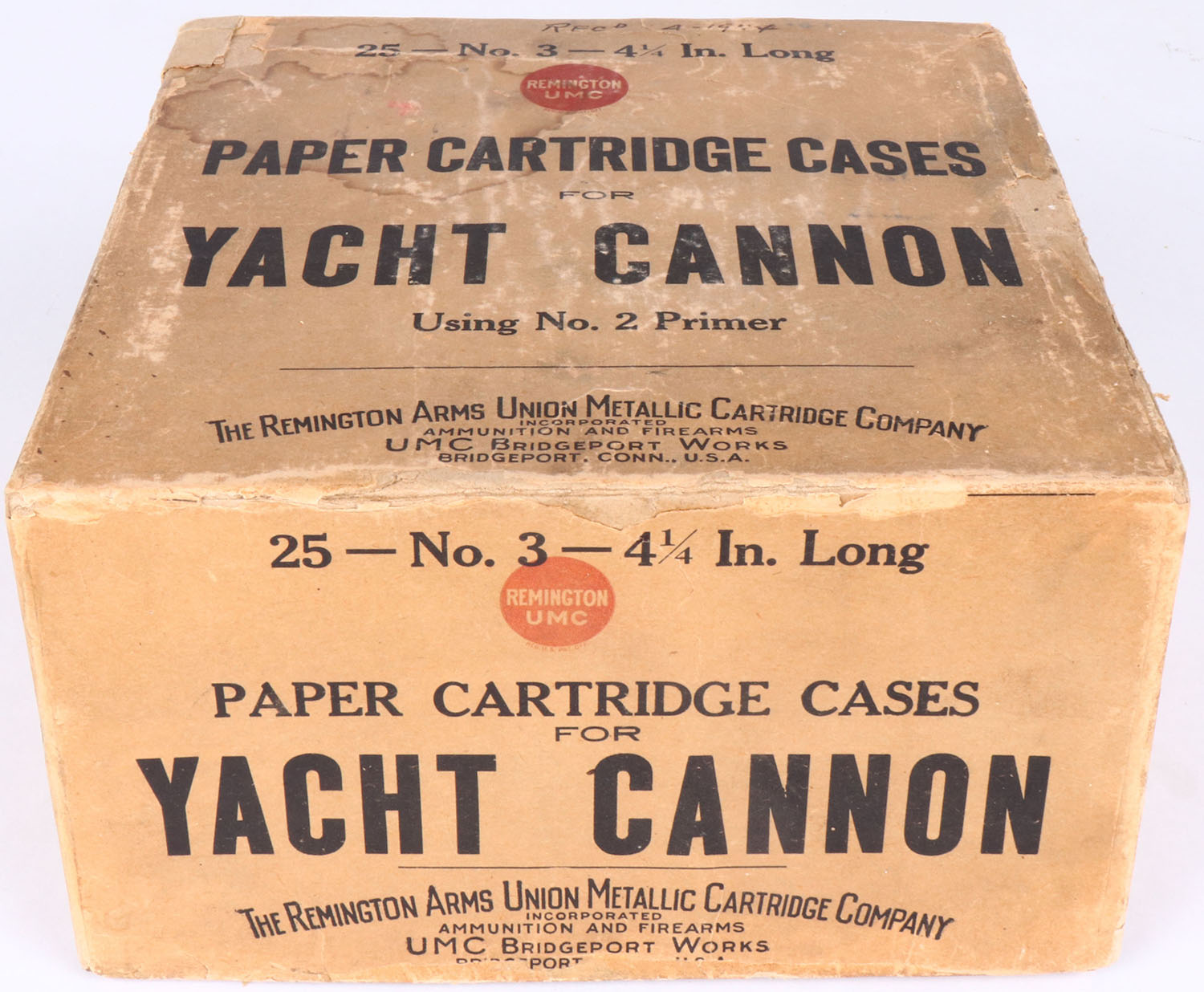 Extremely RARE Remington UMC, YACHT CANNON, 3ga., 2pc., Full, loaded with out shot as they are used for salute cannons or signal cannons, buff box with buff, red & black label, box shows seam spit repairs to inside, label shows some edge wear otherwise very nice, shells are excellent, 4 1/4'' Long. Grade: Excellent - Value: 600 to 1200