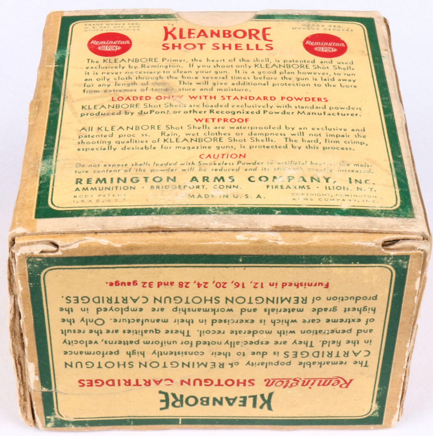 Remington, Kleanbore, 24 GAUGE!!, 1pc., Full, shot size 9C, box is yellow, red and green, box has seam splits, tape repair & light soiling with great colors, shells are excellent. Grade: Excellent - Value: 40 to 150