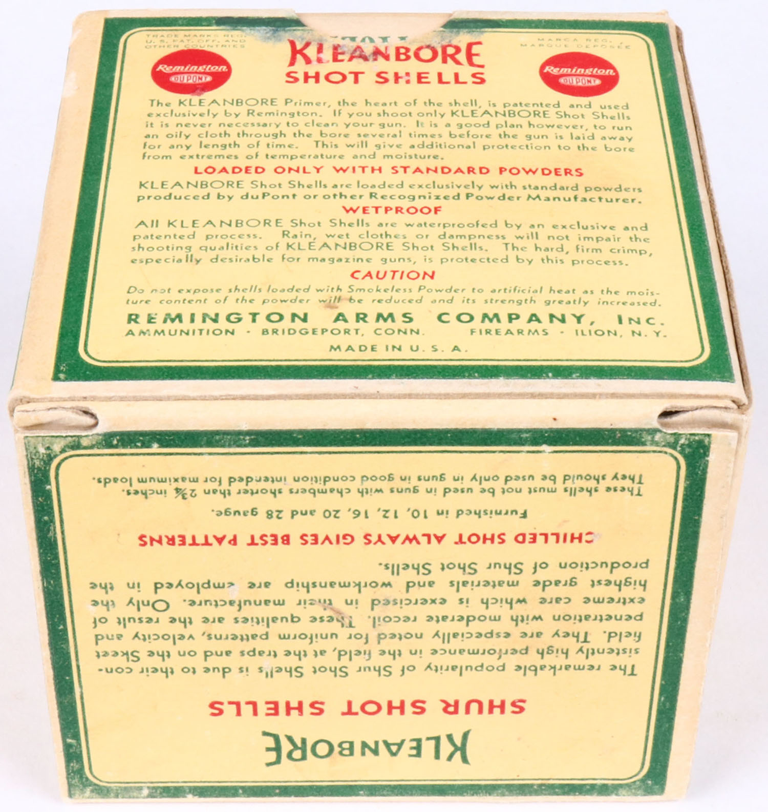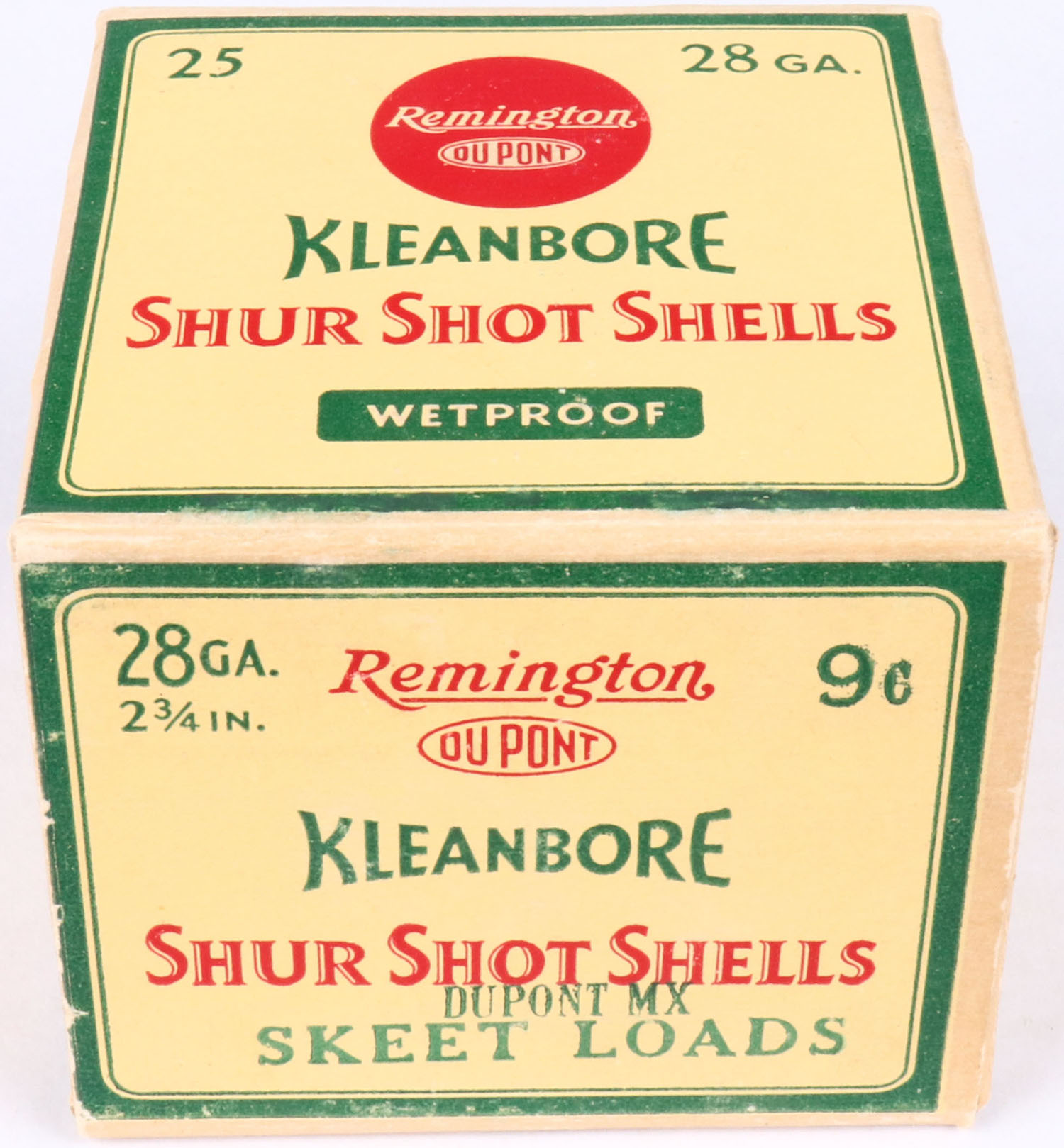 Remington, Kleanbore, SHUR SHOT, 28ga., 1pc., Full, shot size 9C Skeet Loads, box is yellow, red and green, box is very solid, has very light soiling with great colors, shells are excellent. Grade: Excellent + - Value: 20 to 60