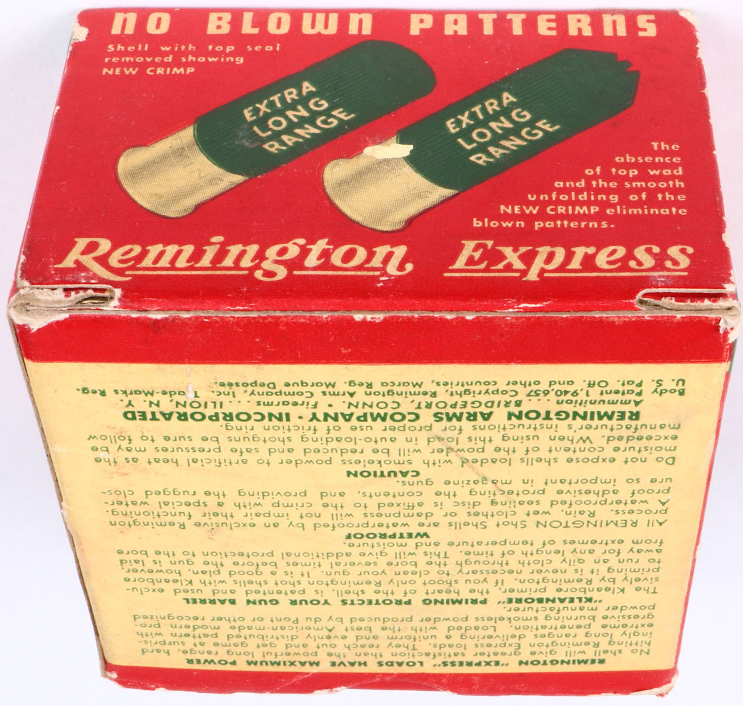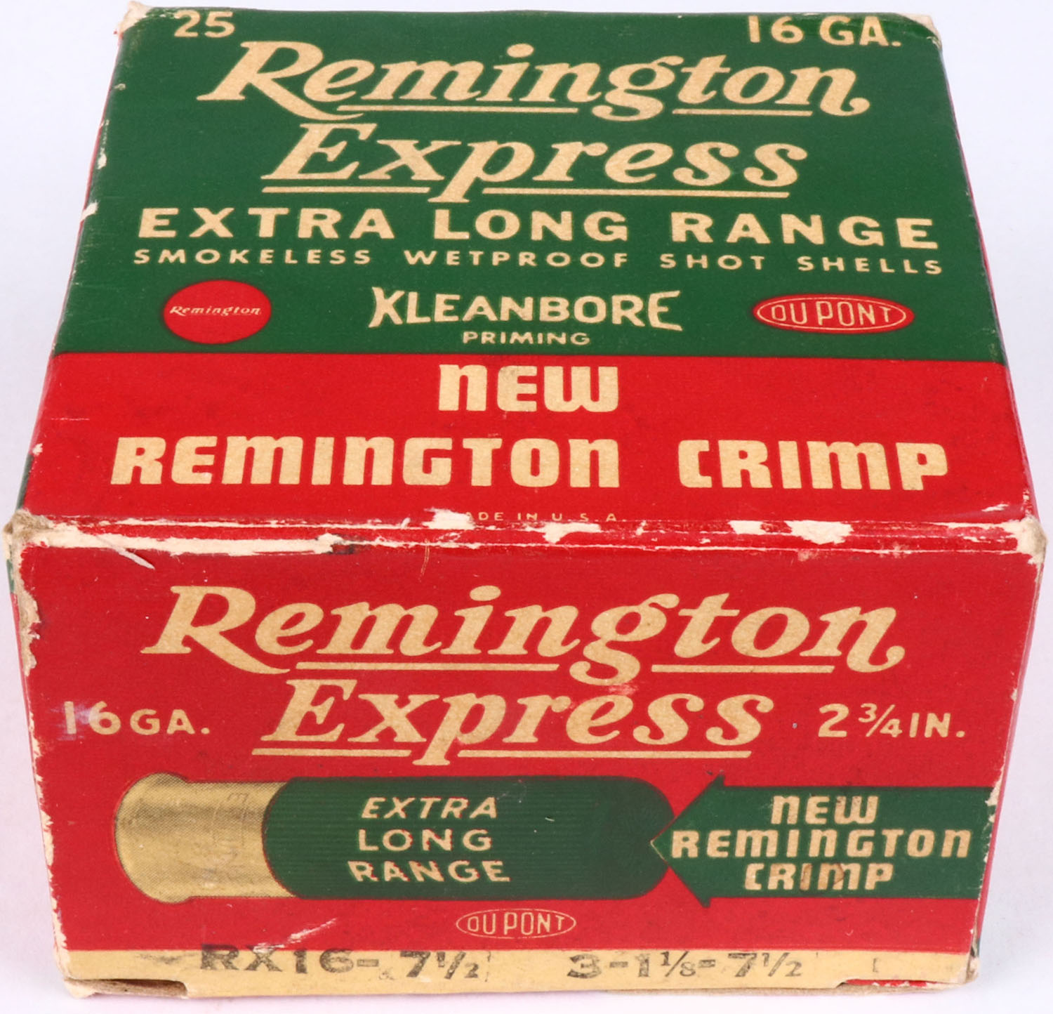 Remington, Express Kleanbore, 16ga., 2 3/4'', 1pc., Full, shot size 7 1/2, box is red, white and green, box is solid, box has light edge wear with great colors, shells are excellent. Grade: Excellent - Value: 10 to 30