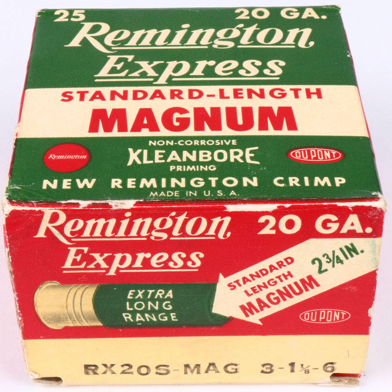 Remington, Express Kleanbore, 20ga., 2 3/4'', 1pc., Full, shot size 6 Magnum, box is red, white and green, box is solid, box has light edge wear & missing top inside flap with great colors, shells are excellent. Grade: Very Good ++ - Value: 10 to 30