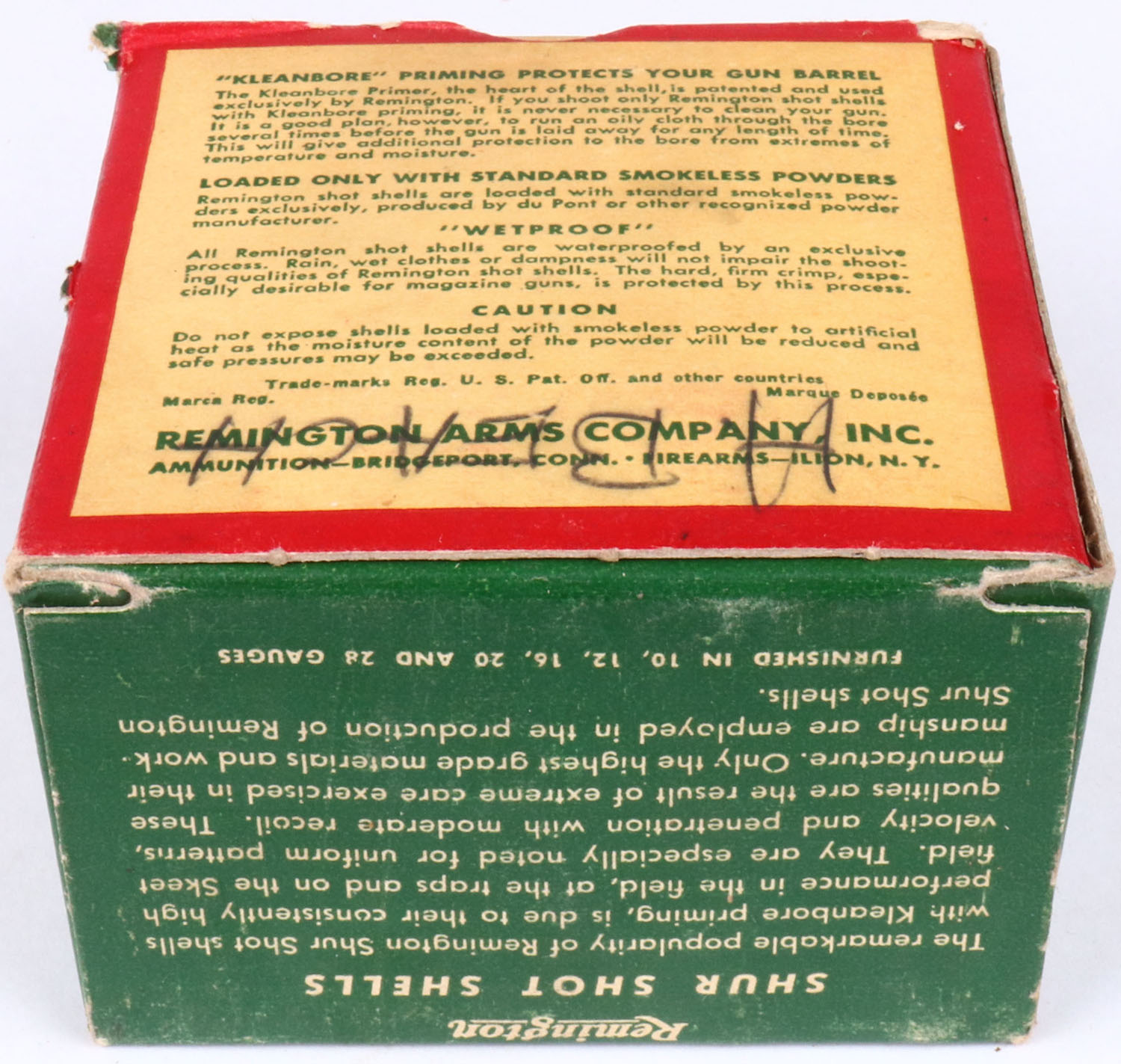 Remington, Shur Shot, 16ga., 2 9/16'', 1pc., Full, shot size 8, box is red, white and green, box is solid, box has light edge wear & light soiling with great colors, shells are excellent. Grade: Excellent - Value: 10 to 30