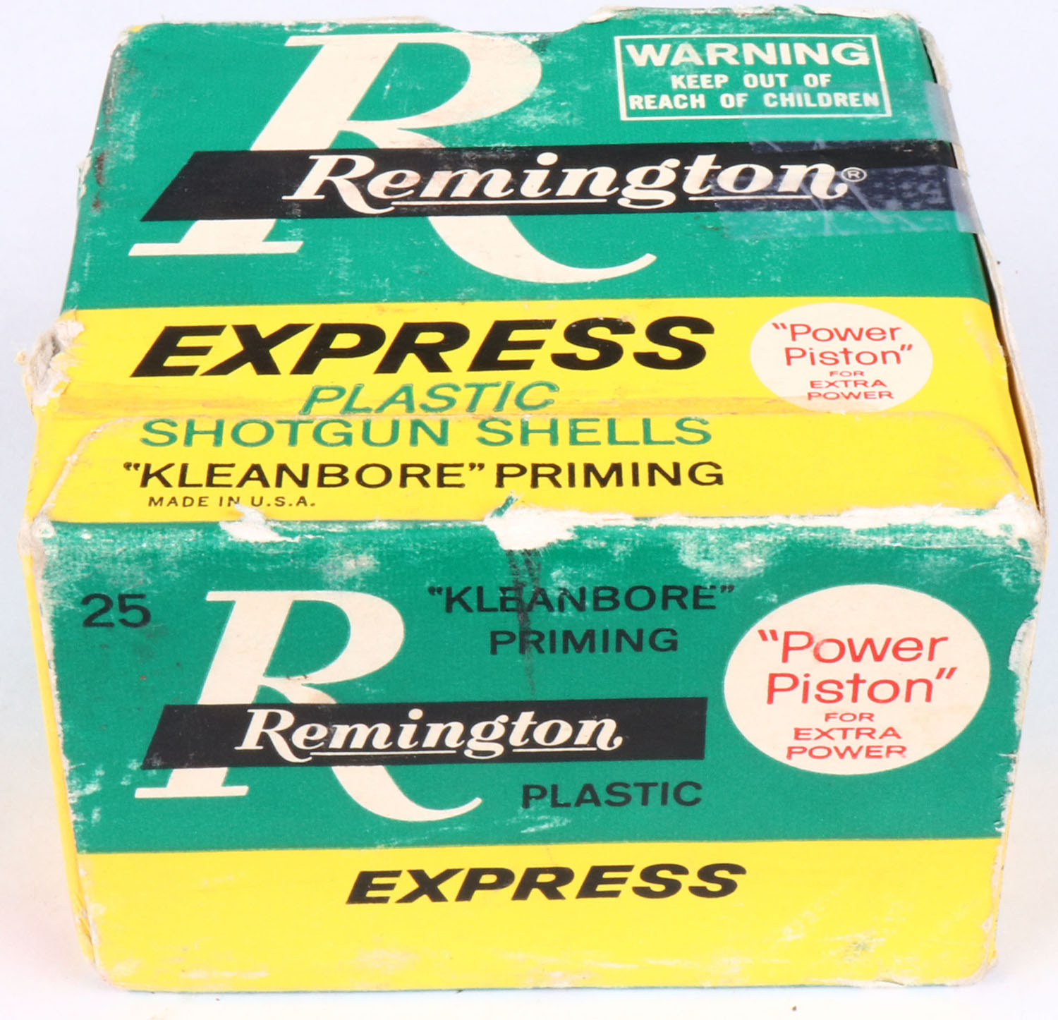 Remington, Express, 16ga., 1pc., Full with 10rds being incorrect, shot size 5, multi-colored box, shells are excellent. Grade: Very Good + - Value: 8 to 20