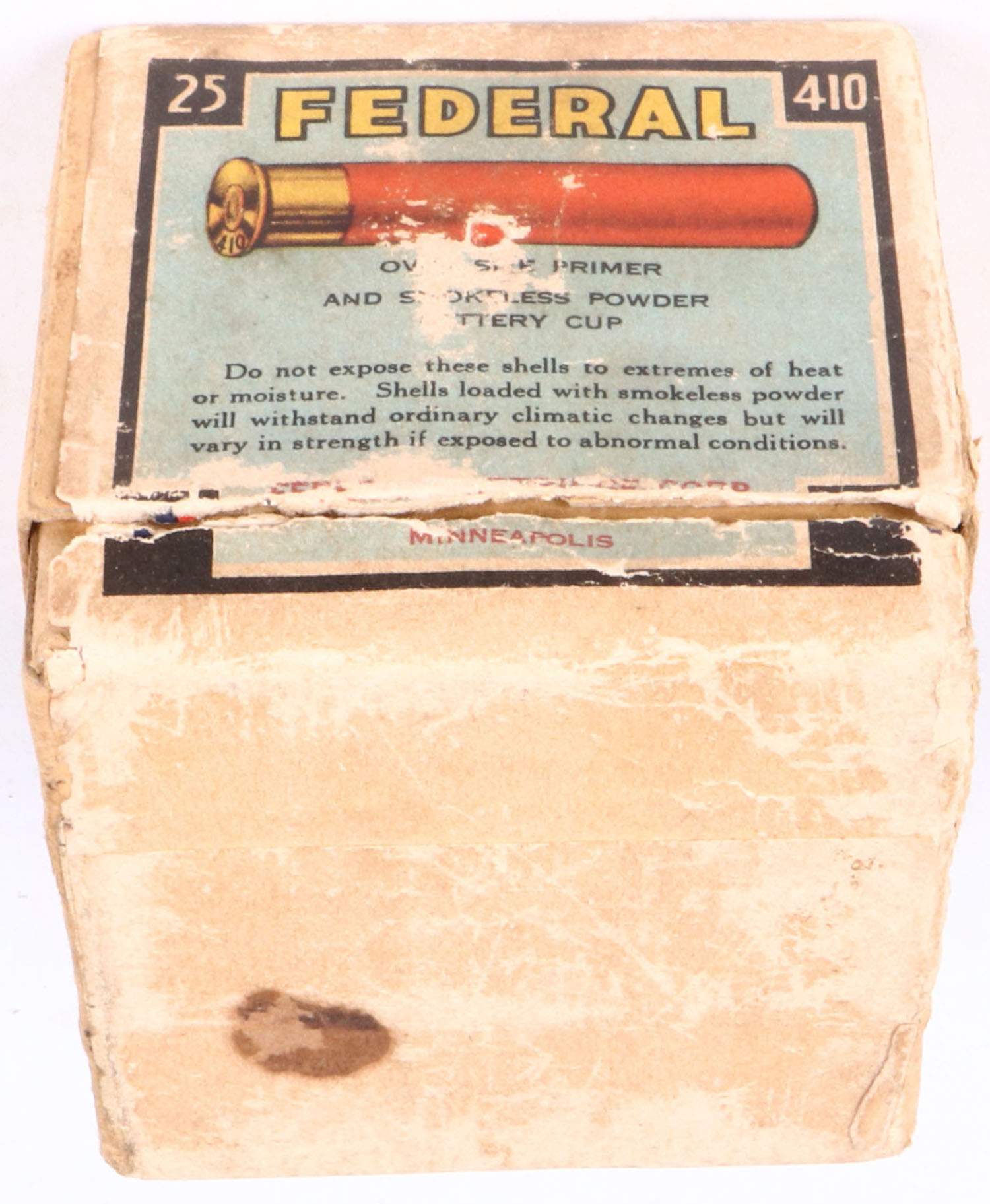 Federal Cart. Co., Hi-Power, 410ga., 2 PIECE!, Partial 20rds., shot size 4ch, buff box with black border, blue, buff and red label with trap shooter in red sweater, box is solid with scuffing & soiling, Shells are excellent. Grade: Very Good ++ - Value: 100 to 400
