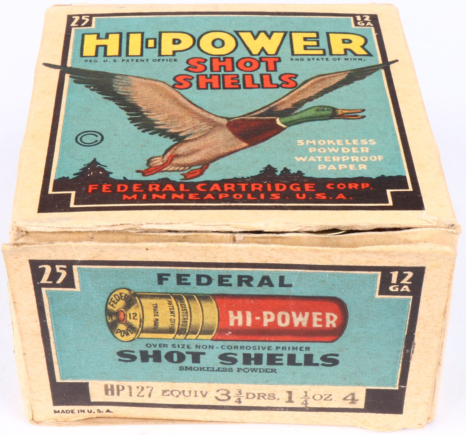 Federal Cart. Co., HI-POWER, 12ga., 1pc., Partial 22rds, shot size 4, Black border, blue, yellow and red box with flying mallard, box has top flap disconnected with very nice color, shells are very good. Grade: Very Good ++ - Value: 20 to 60