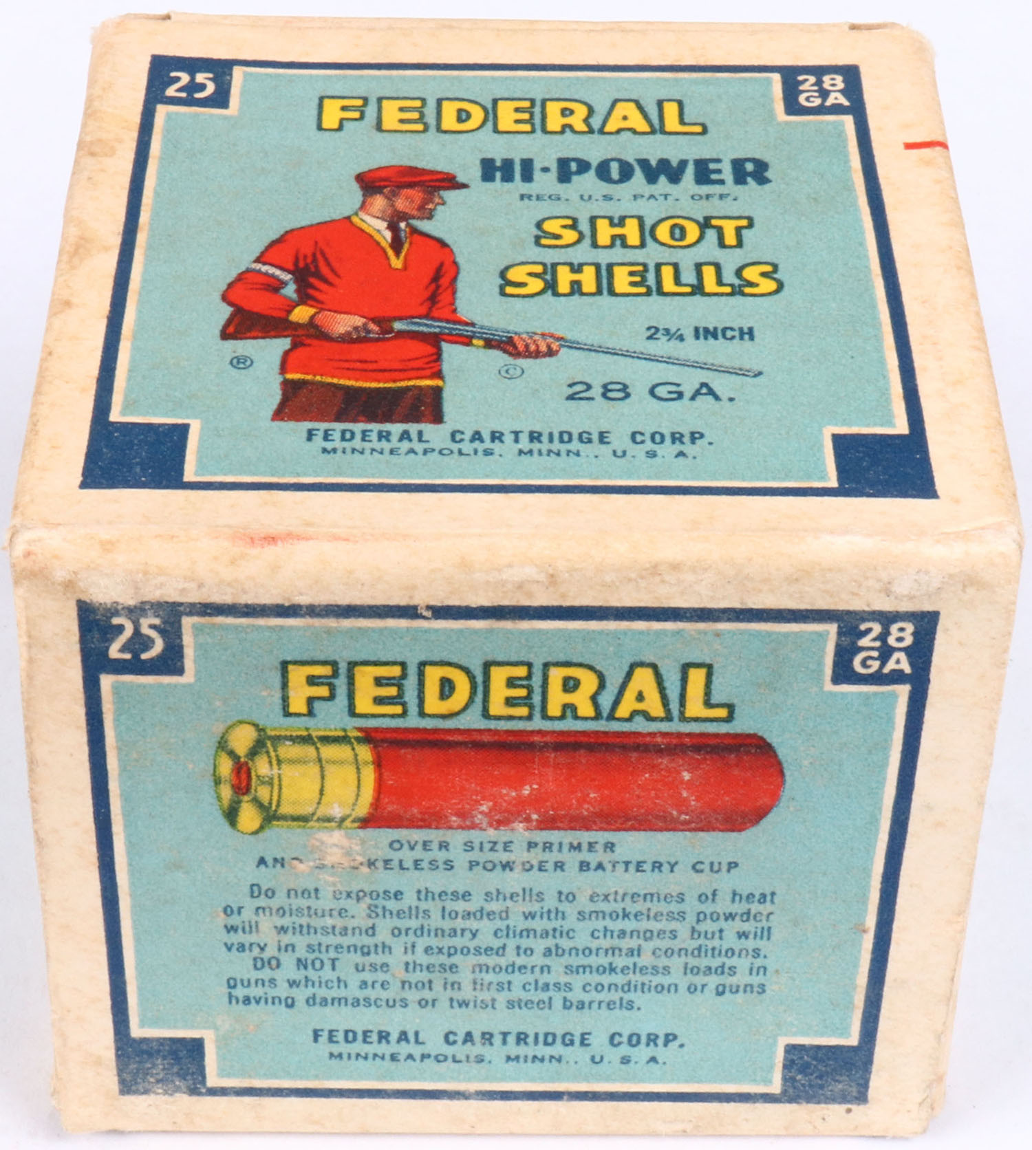 Federal Cart. Co., HI-POWER, 28ga., 1pc., Full, shot size 7 1/2, Blue border, blue, yellow and red box with trap shooter, box has light scuffing, light soiling with great color, shells are very good. Grade: Excellent - Value: 20 to 60