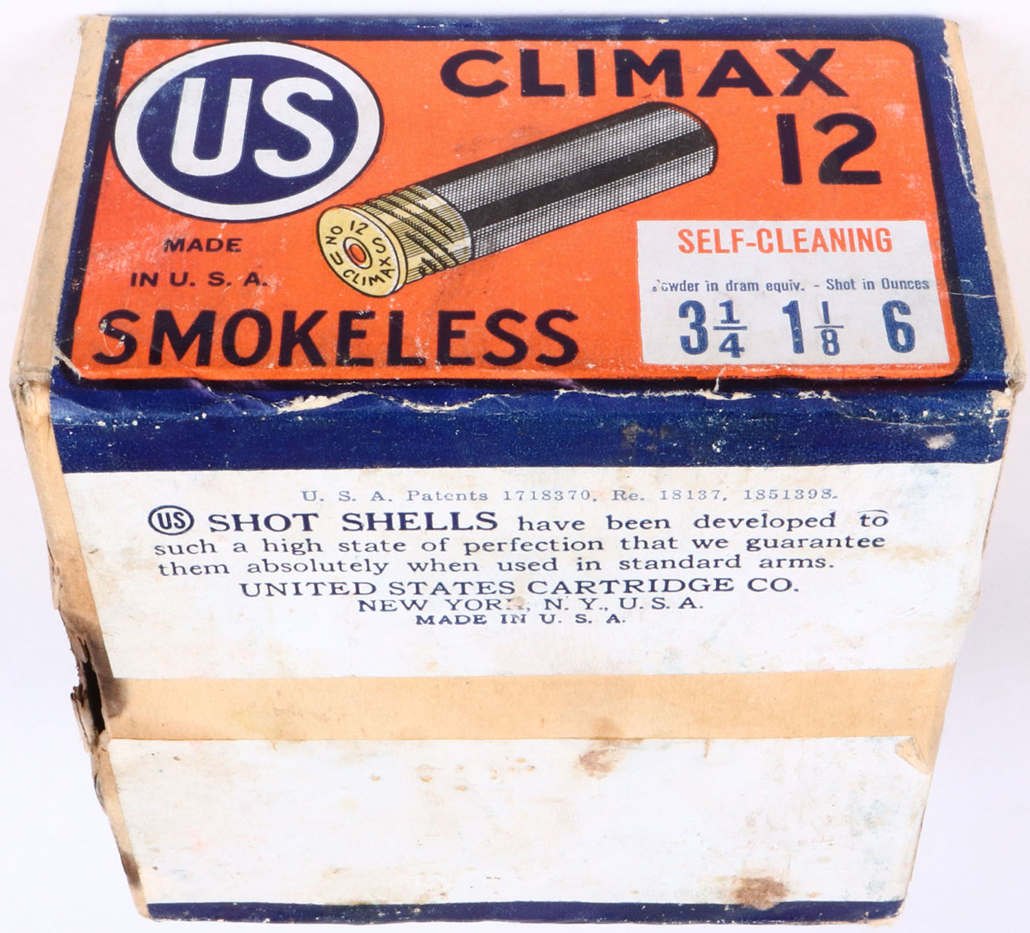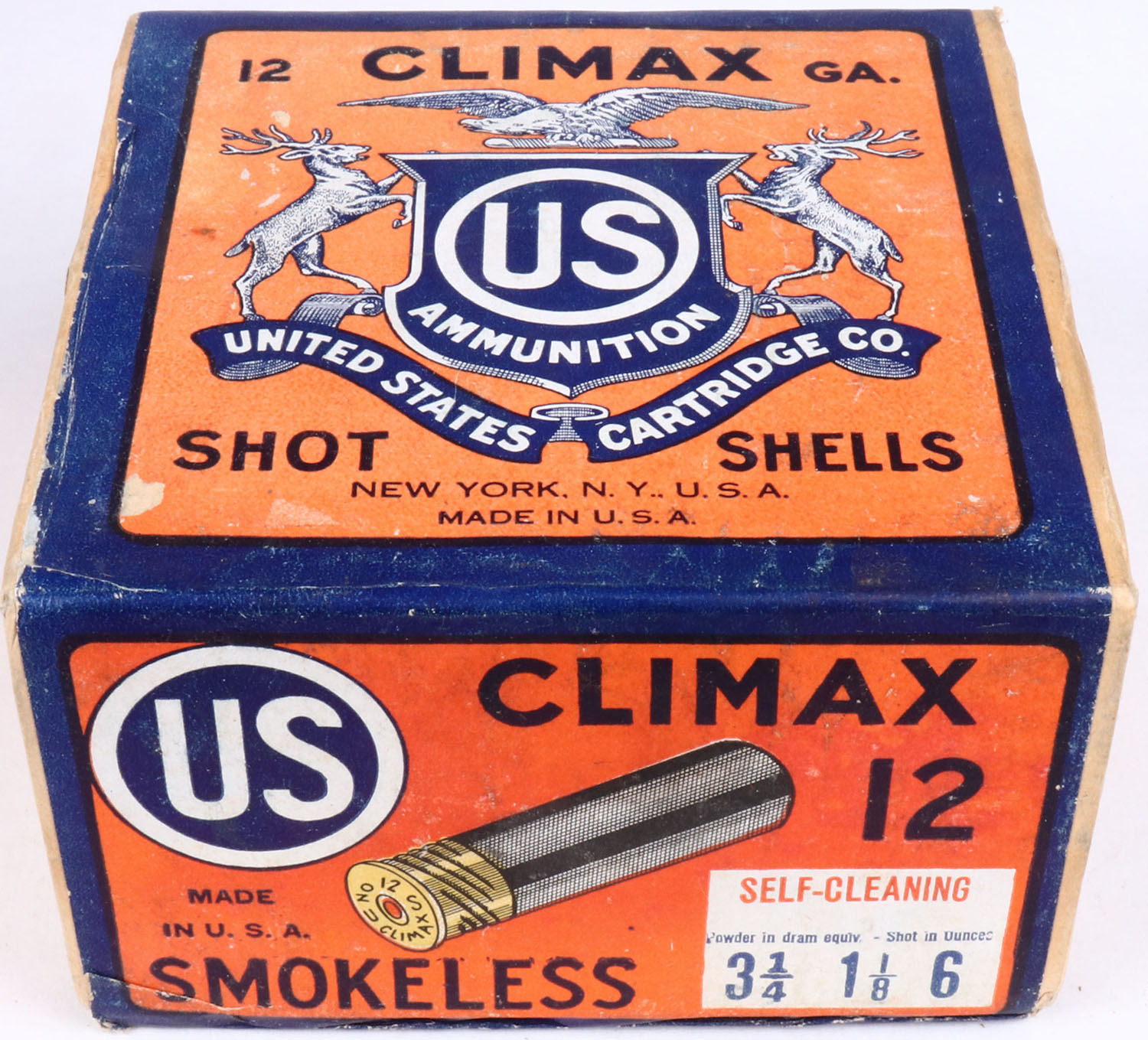US Cart. Co., New York, N.Y, Climax, 12ga, 2pc., FULL & SEALED, shot size 6, buff box orange, blue & white label, box has light soiling & few shell protrusions with great colors. Grade: Excellent - Value: 100 to 400