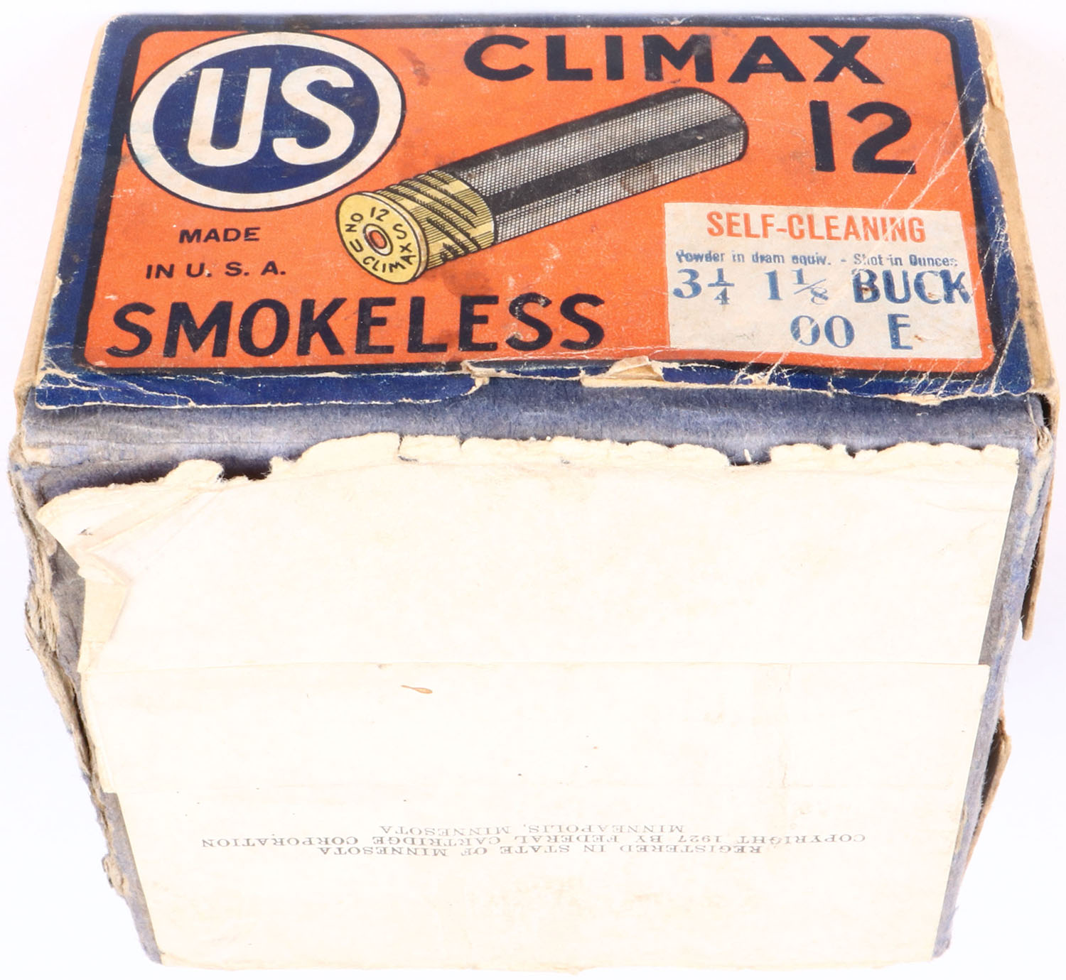 US Cart. Co., New York, N.Y, Climax, 12ga, 2pc., Empty, shot size 00 Buck, buff box orange, blue & white label, box has age soiling, incorrect bottom, seam splits & edge wear with nice colors. Grade: Very Good + - Value: 20 to 100