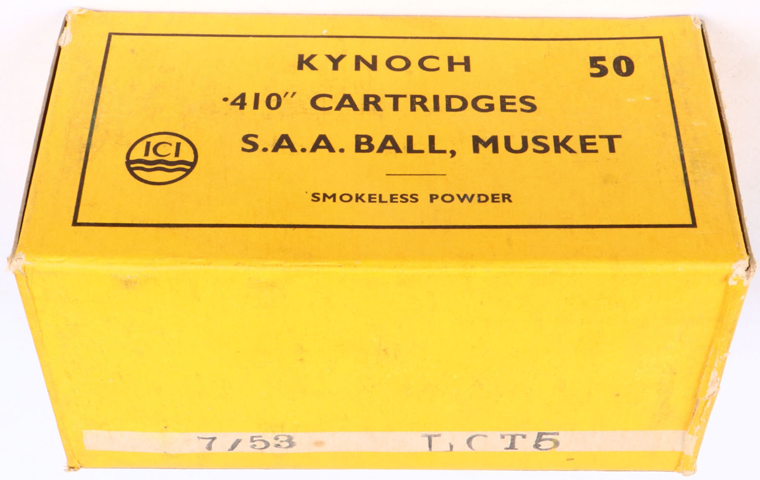 Kynoch, 410ga., 1pc., Full, shot size S.A.A. Ball Musket, multi-colored box, box is solid, shells are excellent. Grade: Very Good ++ - Value: 8 to 20