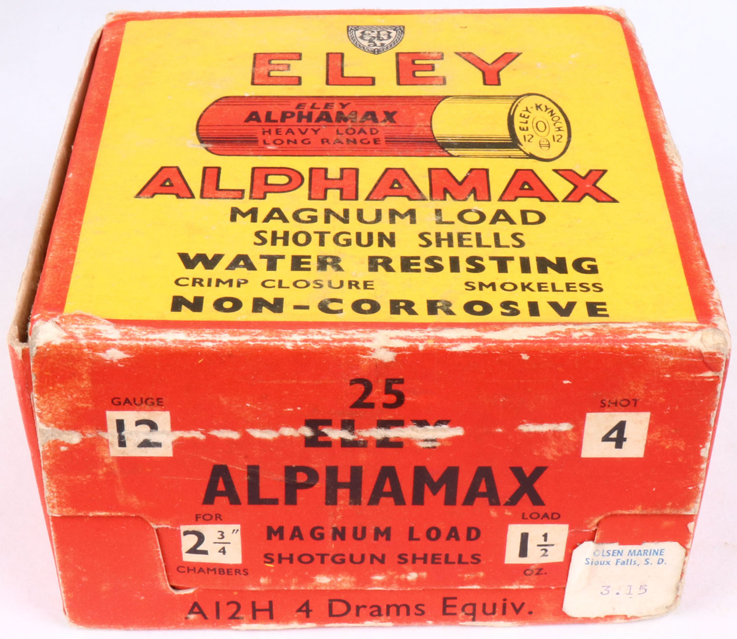 Eley, Alphamax, 12ga., 1pc., Partial 21rds., shot size 4, multi-colored box, box has seam split, Shells are excellent. Grade: Excellent + - Value: 8 to 20