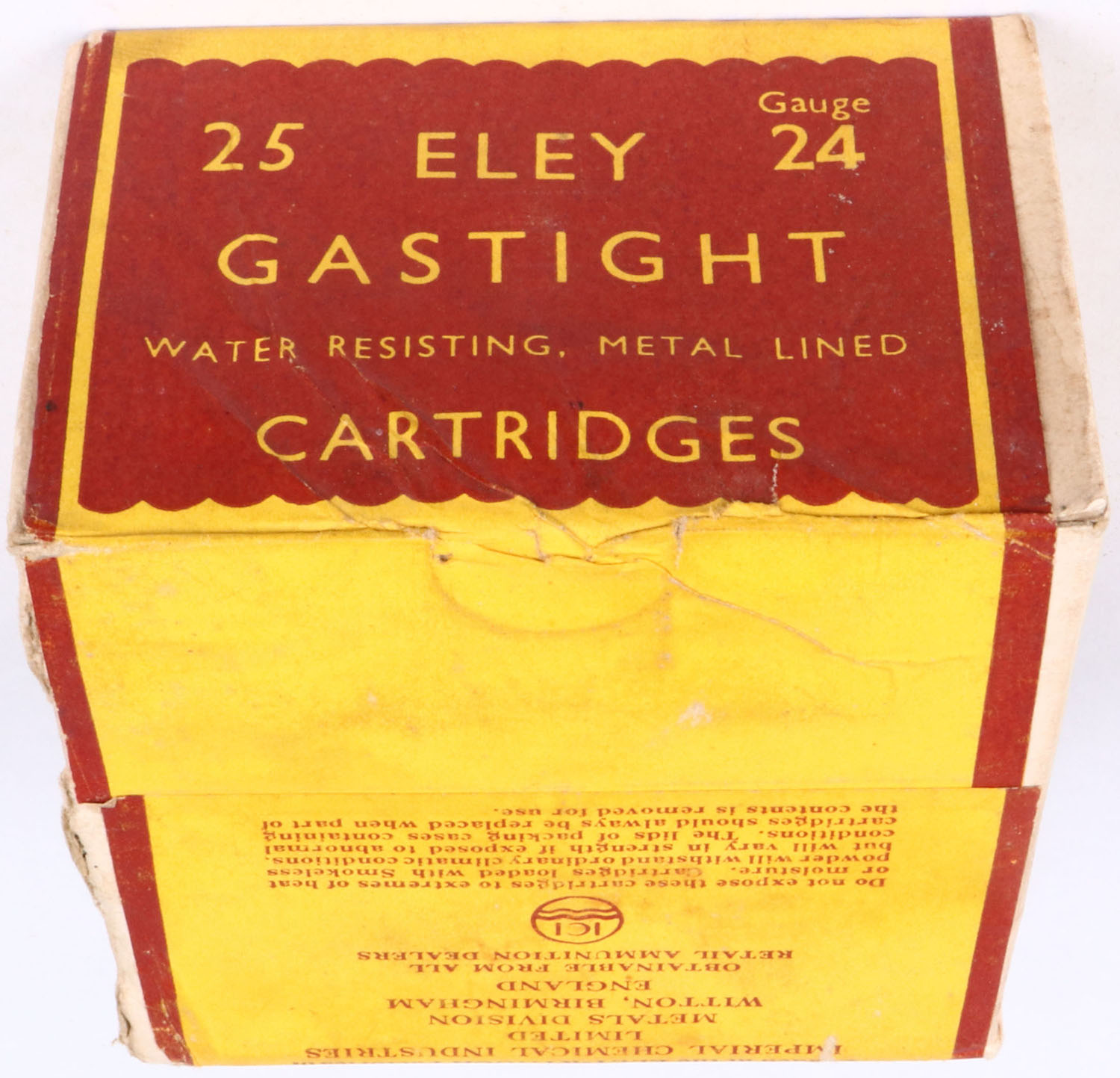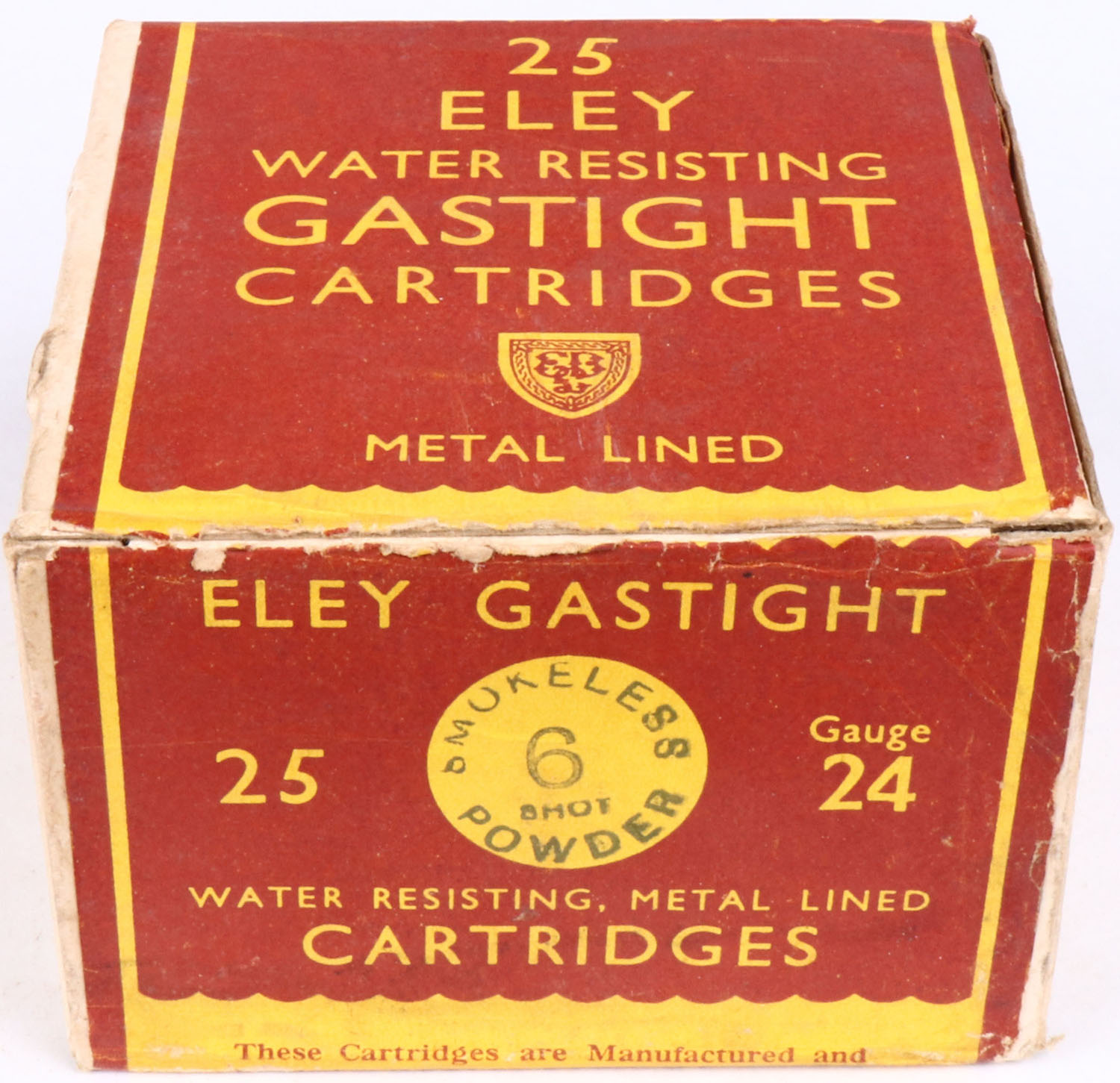 Eley, 24ga., 2pc., FULL & SEALED, shot size 6, multi-colored box, box is very solid. Grade: Excellent + - Value: 8 to 20