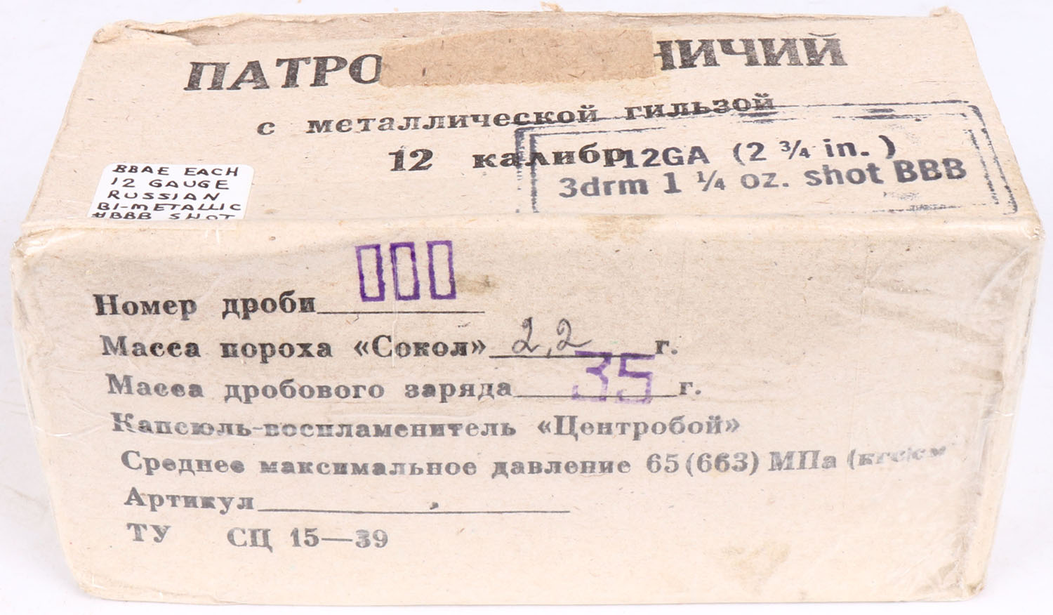 Russian, Iiatpoh Oxothnpnn, 12ga., 1pc., Partial 23rds, shot size 3, copper washed steel shells, Shells are very good. Grade: Excellent + - Value: 8 to 20