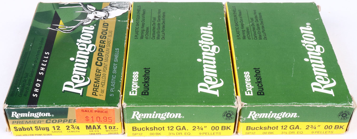 Lot of 3 Remington, 12ga., 1pc., Full, 2 3/4'', shot size 00 Buck & Sabot Slug, multi-colored box, shells are very good. Grade: Excellent - Value: 8 to 20