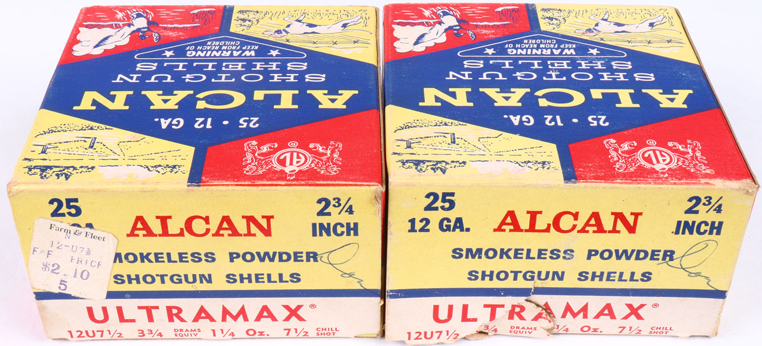 Lot of 2 Alcan, 12ga., 1pc., Full, 2 3/4'', shot size 7 1/2 Chilled, multi-colored box, shells are very good. Grade: Excellent - Value: 8 to 20