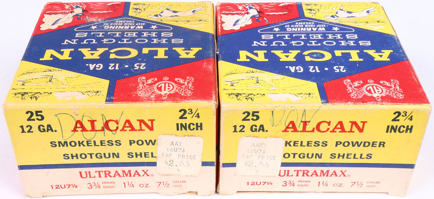 Lot of 2 Alcan, 12ga., 1pc., Full, 2 3/4'', shot size 7 1/2 Chilled, multi-colored box, shells are very good. Grade: Excellent - Value: 8 to 20