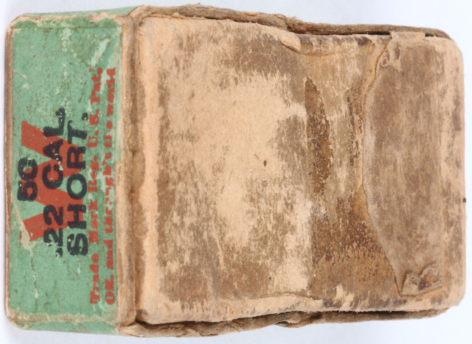 Winchester, Rifle Cartridges, .22 Short, RR: WRA-42 S-17, Partial 31rds., 2pc. Buff box with green top & side sealing labels, box is solid with very good color, some age soiling & shelf wear, minor edge & corner wear, labels are intact, ammo is very good. Grade: Very Good + - Value: 30 to 120
