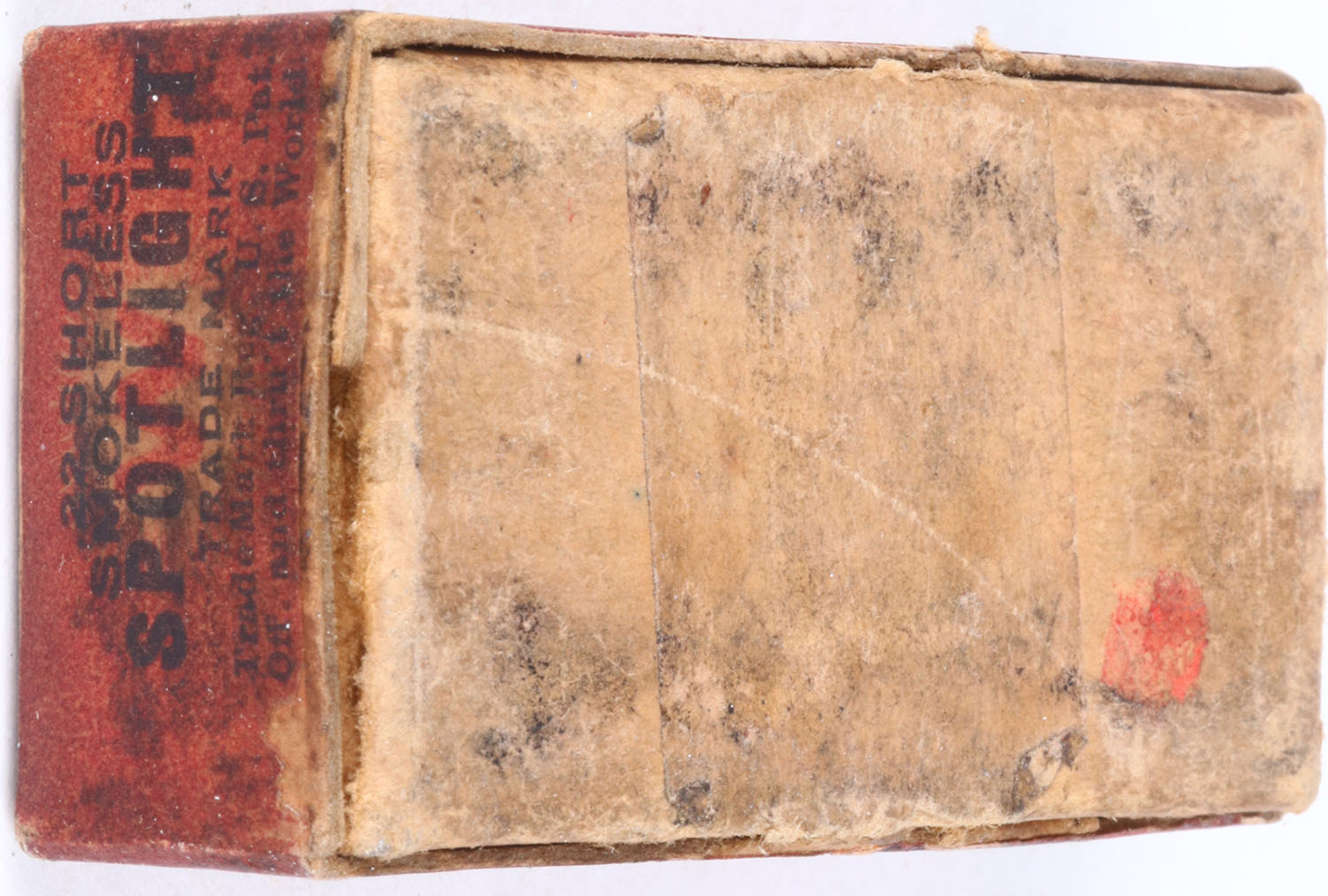 Winchester, Spotlight, .22 Short, Smokeless, RR: WRA-77 S-2a, Partial 43rds., 2pc. Buff box with red top & side sealing labels, box is solid with good to very good color, age soiling, some color fading to top, very minor shelf wear, minor edge & corner wear, labels are intact, ammo is good. Grade: Very Good + - Value: 40 to 120
