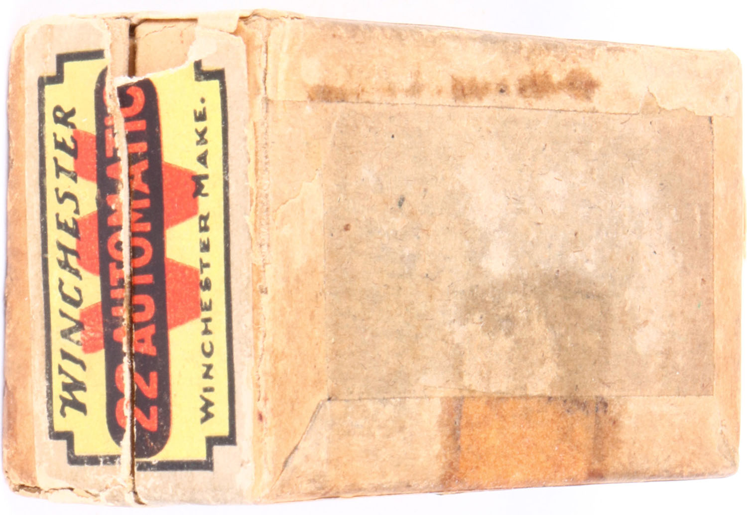 Winchester, .22 Automatic Rim Fire Smokeless Powder Cartridges, RR: WRA-169 WA-6b, Full, 2pc. Buff box with yellow and red top & side sealing labels, box is solid with very good color, age soiling, stain on top & front side, very minor shelf wear, partial vertical seam splits to left end of lid, some corner wear, very minor edge wear, labels are intact, ammo is excellent. Grade: Very Good ++ - Value: 50 to 150