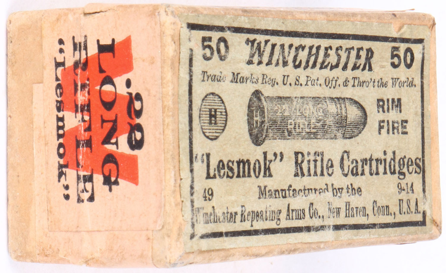 Winchester, ''Lesmok'' Rifle Cartridges, .22 Long Rifle, LR-26b, Full, 2pc. Buff box with green top & buff side sealing labels, box is solid with excellent color, very minor age soiling & shelf wear, very minor edge & corner wear, labels are intact, ammo is very good. Grade: Excellent + - Value: 30 to 90