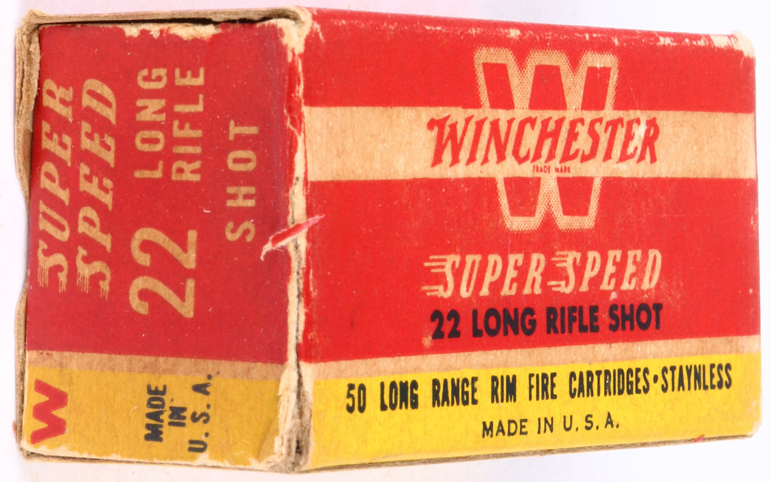 Winchester, Super Speed, .22 Long Rifle Shot, RHWeb: WRA-17 LR-5d, Full, 1pc. Red yellow & white box, box is solid with excellent color, some age soiling & corner wear, edges are mostly crisp, partial seam split to right end flap, left end flap is solid, ammo is excellent. Grade: Very Good ++ - Value: 20 to 60