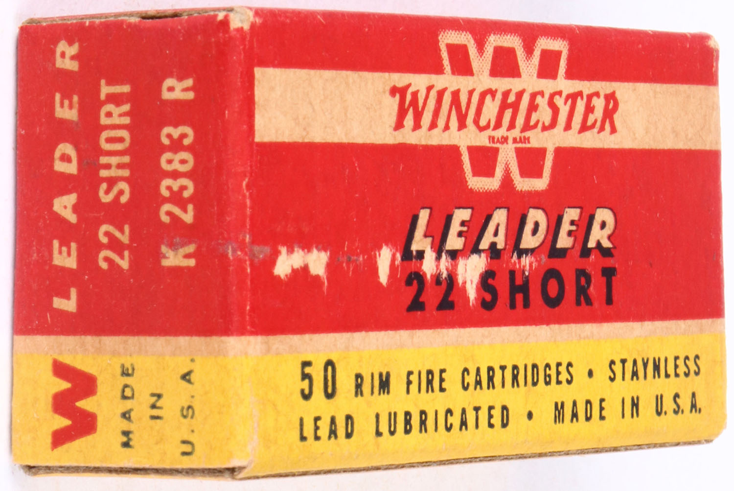 Winchester, Leader, .22 Short, RHWeb: WRA-55, S-2a, Full, 1pc. Red yellow & white box, box is solid with very good to excellent color, age soiling, corners are mostly sharp, edges are crisp, end flaps are solid, ammo is excellent. Grade: Excellent - Value: 6 to 30