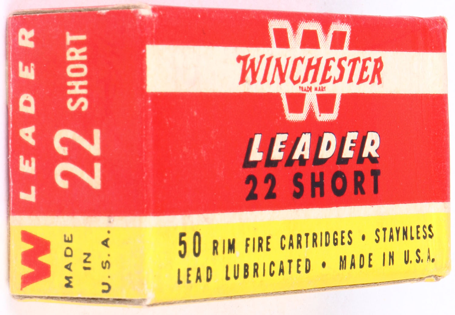 Winchester, Leader, .22 Short, RhWeb: WRA-55 S-2c, Full, 1pc. Red yellow & white box, box is solid with excellent color, only very minor age soiling & color bleeding, corners are sharp, edges are crisp, end flaps are solid, ammo is very good to excellent. Grade: Excellent ++ - Value: 10 to 50