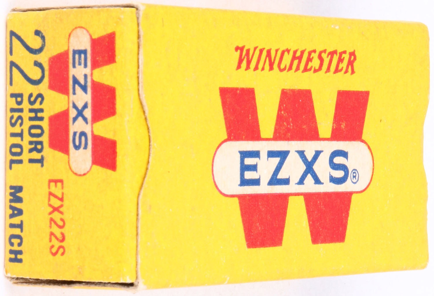 Winchester, EZXS, .22 Short, Pistol Match, RHWeb: WRA-54 S-1, Full, 1pc. Yellow red & white box, box is solid with excellent color, some age soiling, corners are mostly sharp, edges are crisp, end flaps are solid, ammo is excellent. Grade: Excellent ++ - Value: 10 to 50