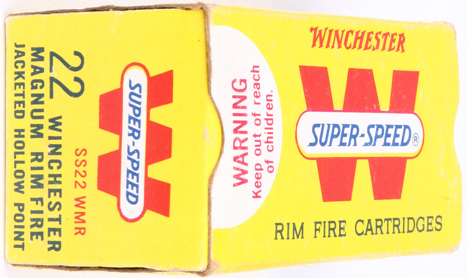 Winchester, Super-Speed, .22 Winchester Magnum Rim Fire, Full Metal Case, RHWeb: WRA-20 WMR-1c, Full, 1pc. Yellow red & white box, box is solid with very good color, some shelf wear, minor age soiling, some edge & corner wear, end flaps are solid, ammo is excellent. Grade: Excellent - Value: 10 to 50