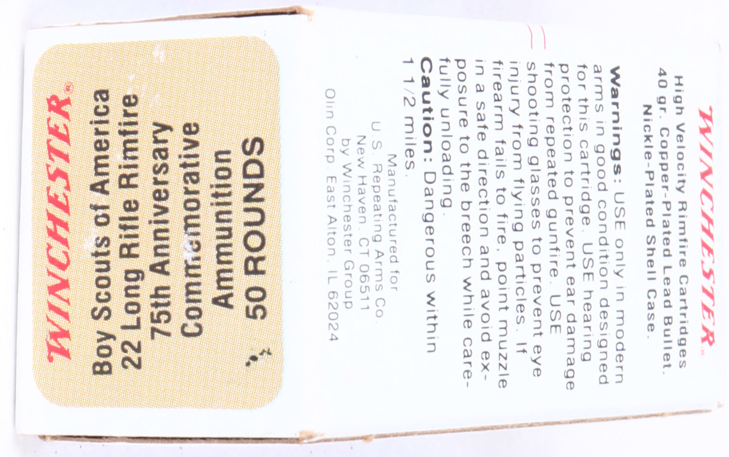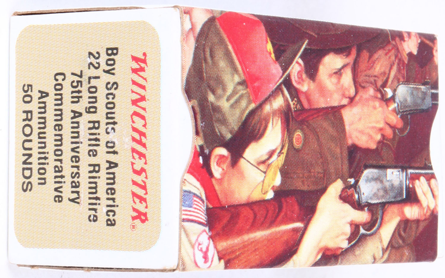 Winchester, Boy Scouts of America 75th Anniversary, .22 Long Rifle, RHWeb: WRA-70 LR-1, Full, 1pc. Multicolored box, box is mint with minty color, sharp corners, crisp edges, rigid end flaps, ammo is minty. Grade: MINT - Value: 10 to 50