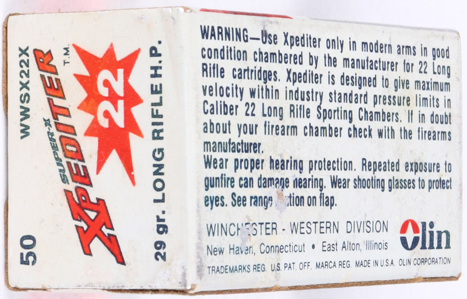 Winchester-Western, Super-X Xpediter, .22 Long Rifle Hollow Point, Xtra High Velocity, RHWeb: WW-1 LR-11b, Full, 1pc. Silver red & white box, box is solid with excellent color, some scuffing to top, corners are mostly sharp, edges are crisp, end flaps are solid, ammo is excellent. Grade: Excellent - Value: 8 to 40
