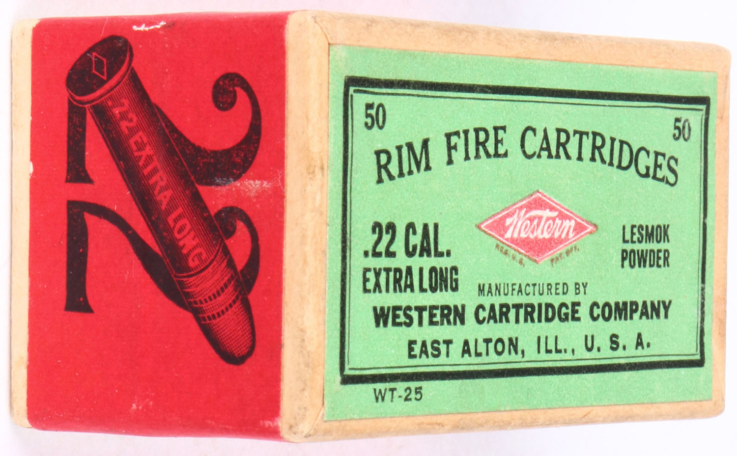 Western, Rim Fire Cartridges, .22 Extra Long, Lesmok Powder, RHWeb: WCC-3 XL-1a, FULL & SEALED, 2pc. Buff box with green top & red side sealing labels, box is solid with excellent to minty color, only very minor age soiling & shelf wear, corners are mostly sharp, edges are crisp, labels are intact. Grade: Excellent ++ - Value: 300 to 600