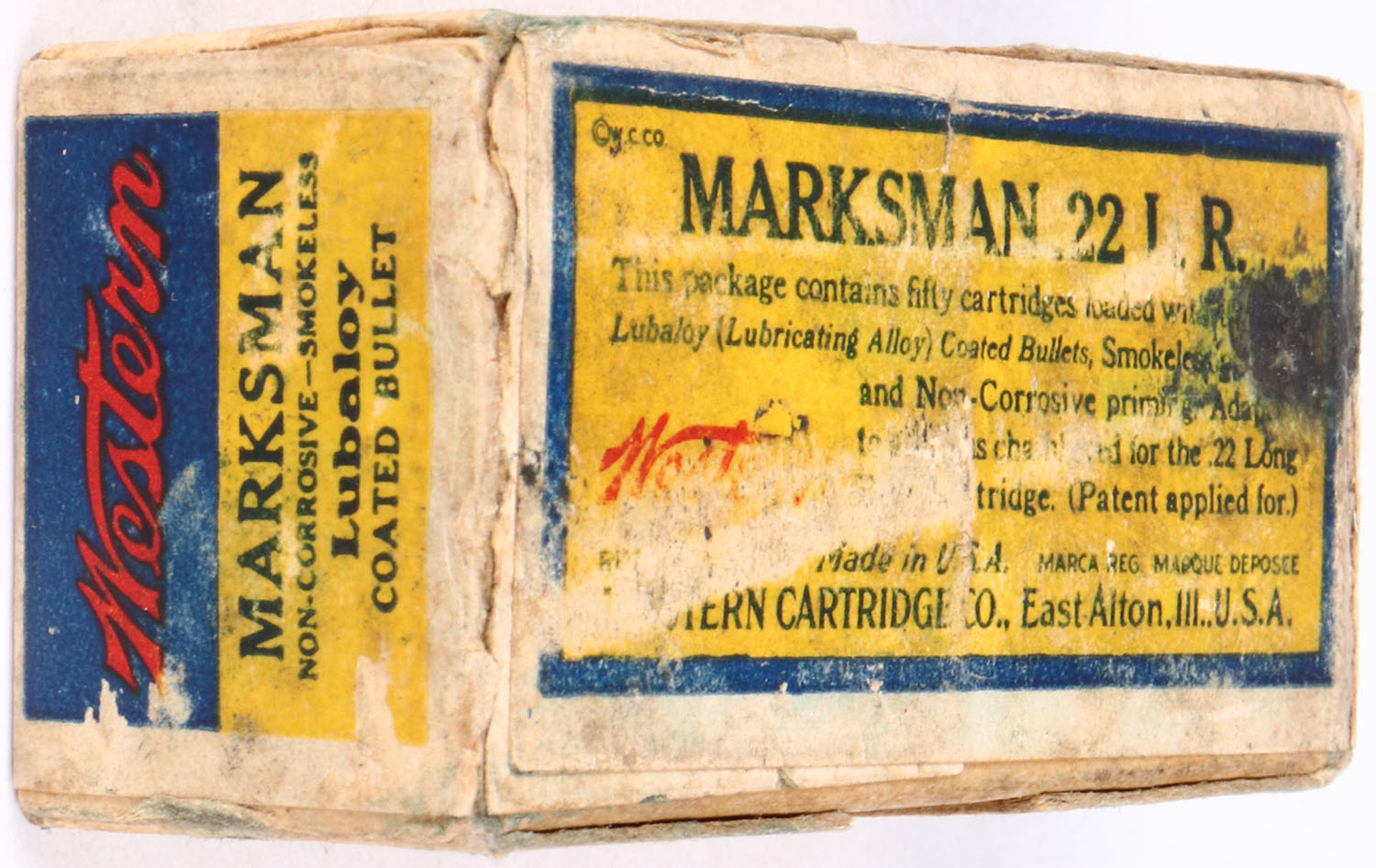 Western, Marksman .22 L.R., .22 Long Rifle, Lubaloy (Lubricating Alloy) Coated Bullet, RHWeb: WCC-50 LR-7 Full, 2pc. Buff box with multi-colored wraparound bullseye label, box is solid with good to very good color, shelf wear, some age soiling, staining to front and bottom, very minor corner wear, edges are mostly crisp, label is intact. Grade: Very Good + - Value: 20 to 60
