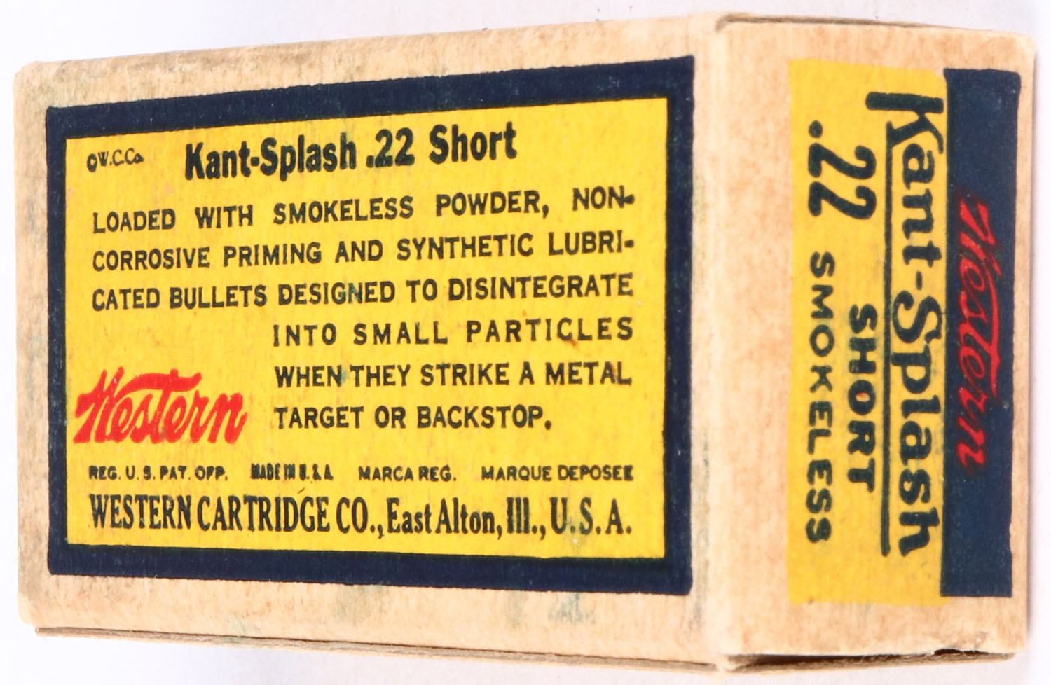 Western, Kant-Splash, .22 Short, Smokeless, RHWeb: WCC-49 S-1b, Full, 1pc. Yellow blue & red bullseye box, box is solid with very good color, some age soiling, very minor corner wear, edges are mostly crisp, end flaps are solid, ammo is very good to excellent. Grade: Excellent - Value: 200 to 400