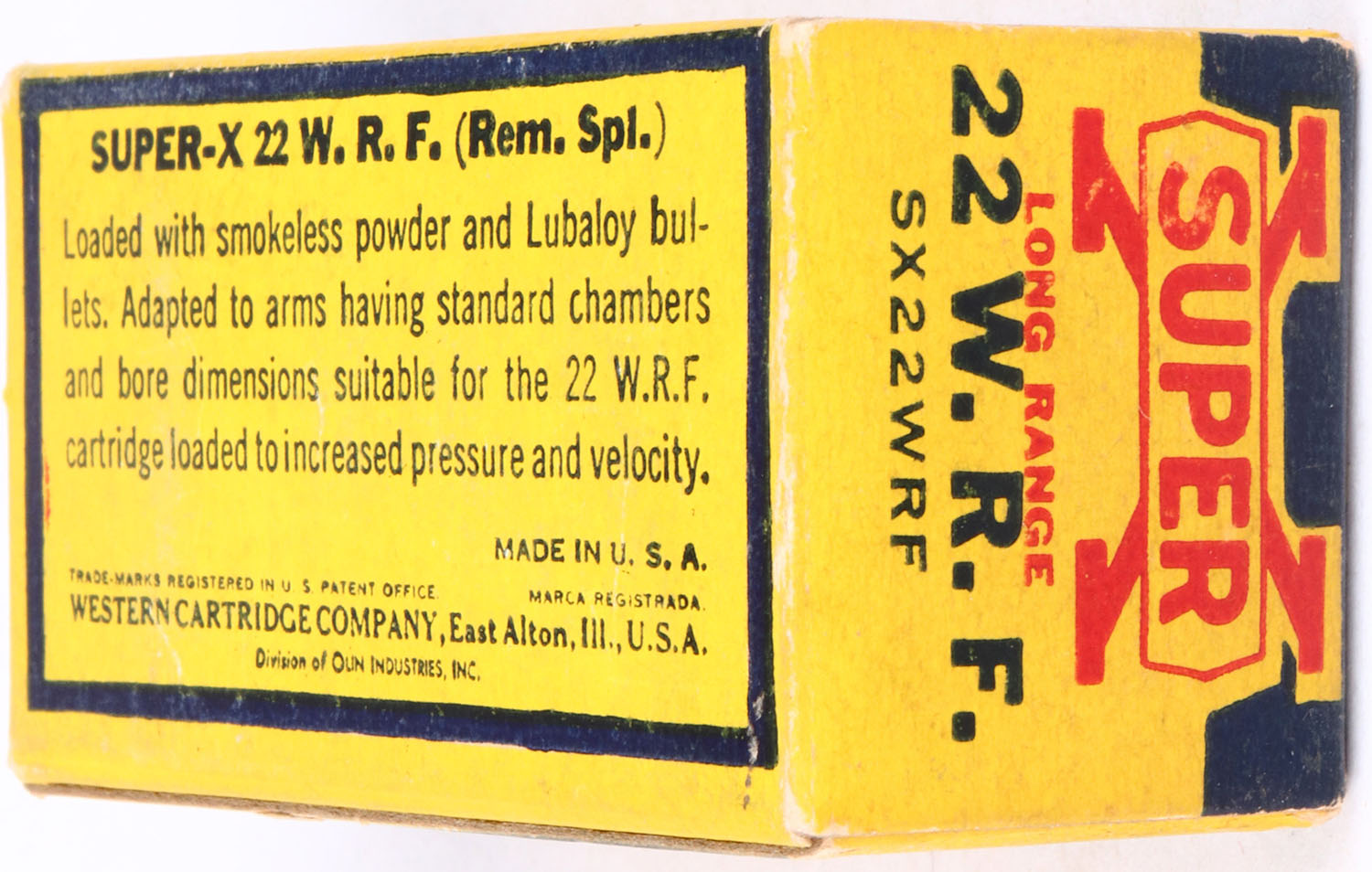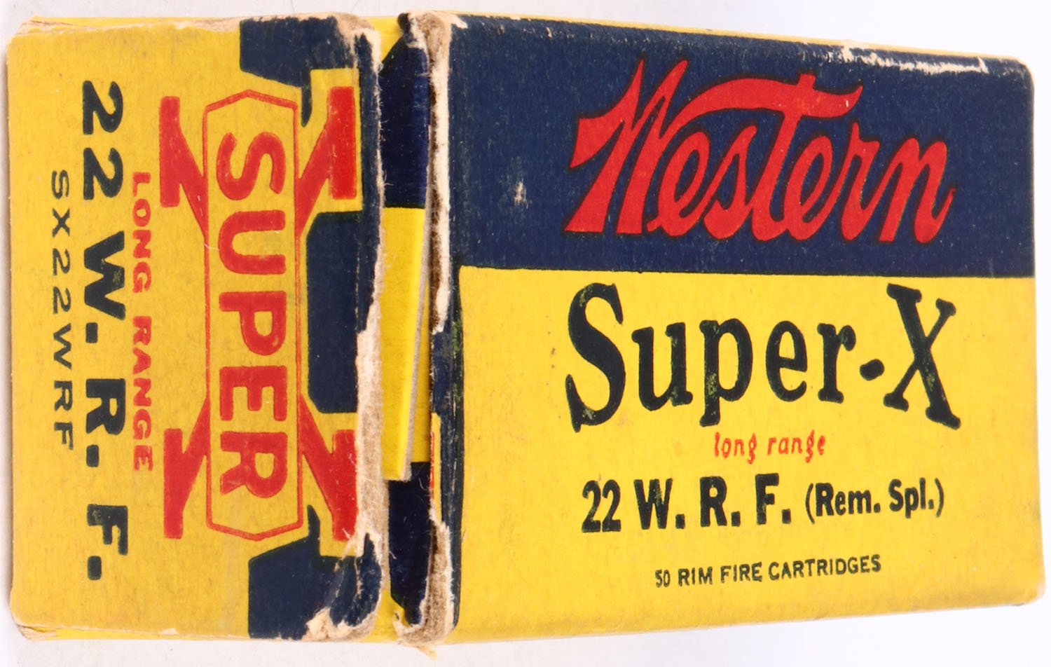 Western, Super-X, .22 W.R.F. (Rem. Spl.), RHWeb: Super-X-12 WRF-19, Full, 1pc. Yellow blue & red box, left end flap is torn, box has very good to excellent color, some age soiling, minor corner wear, very minor edge wear, right end flap is solid, ammo is excellent. Grade: Very Good + - Value: 6 to 30