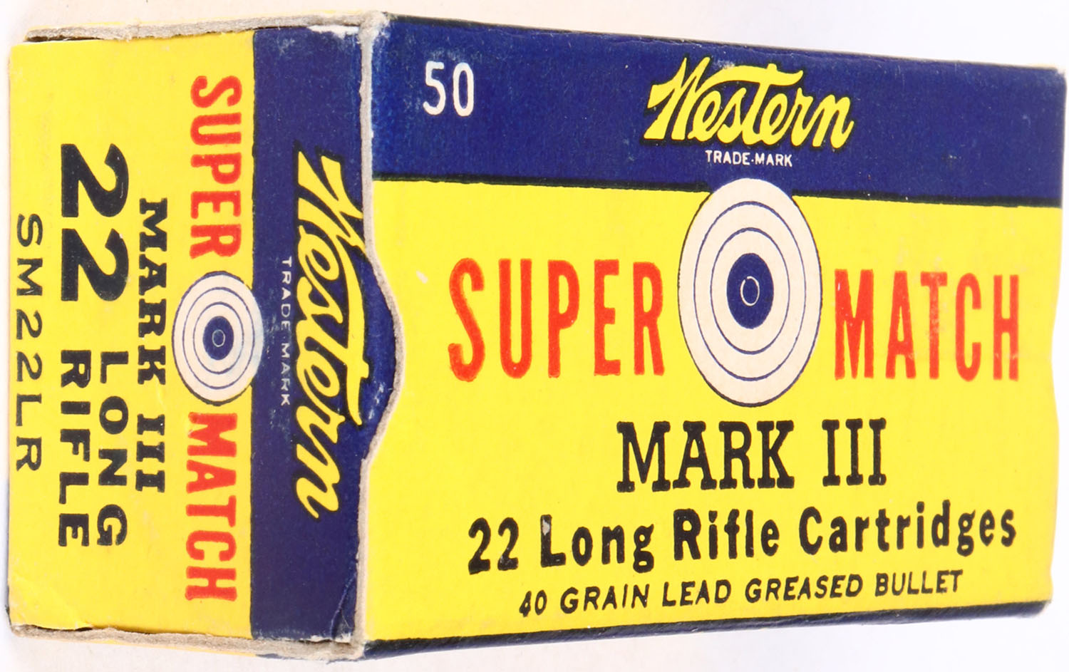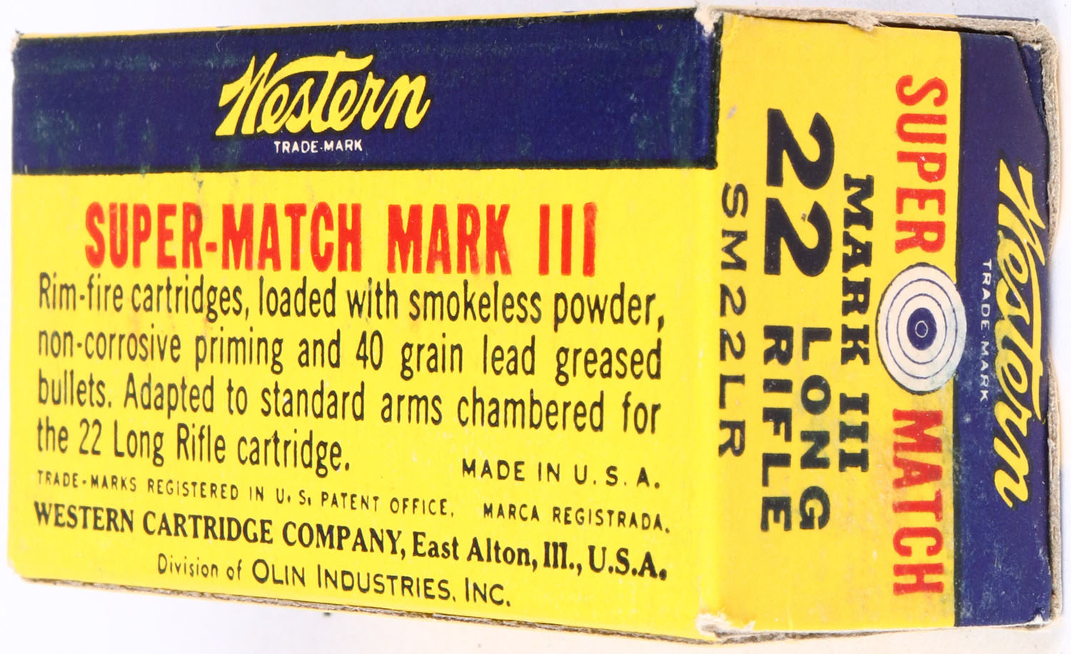 Western, Super Match Mark III, .22 Long Rifle, RHWeb: WCC-51.3 LR-1bb, Full, 1pc. Yellow blue & red box, box is solid with excellent to minty color, very minor corner wear, edges are crisp, end flaps are solid, ammo is excellent to minty. Grade: Excellent ++ - Value: 10 to 50