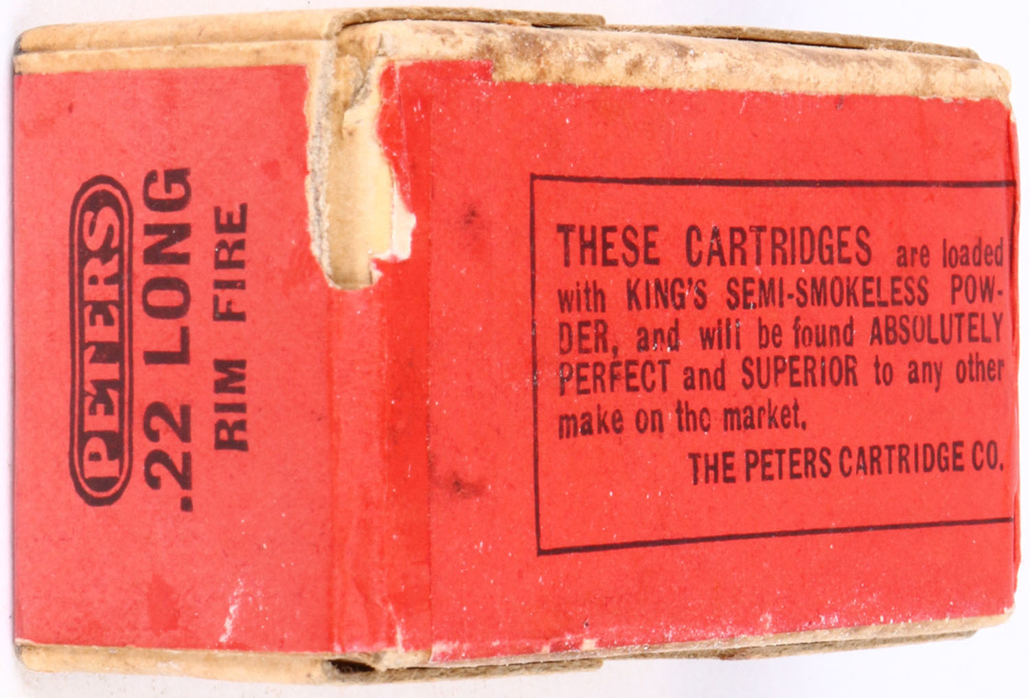Peters, Rim Fire Cartridges, .22 Long, Swaged Bullet, RHWeb: PCC-4 L-1d, FULL & SEALED, 2pc. Buff box with red wraparound label, box is solid with excellent color, minor staining to front and back sides, corners are mostly sharp, edges are crisp, label is intact. Grade: Excellent + - Value: 10 to 50