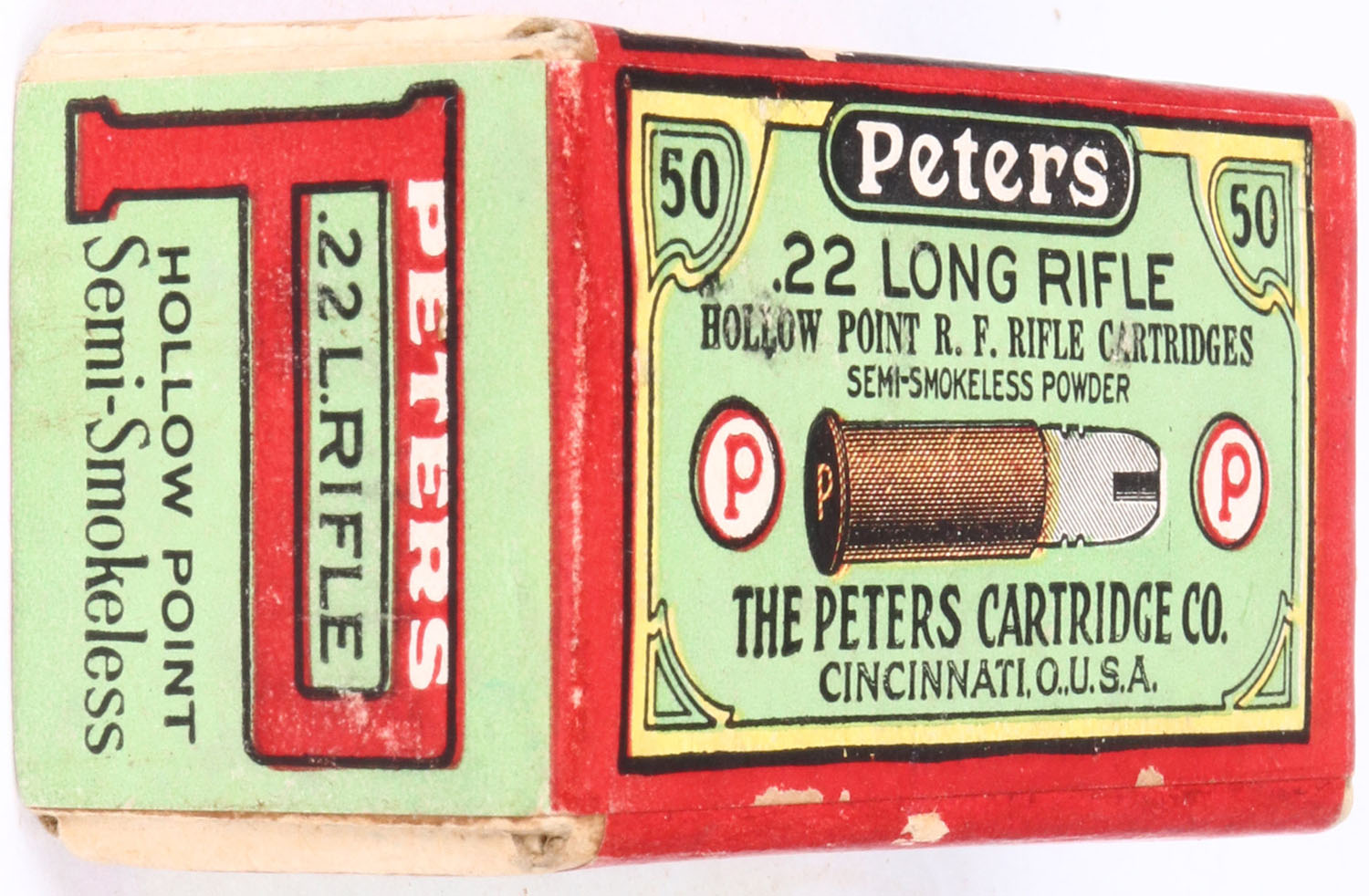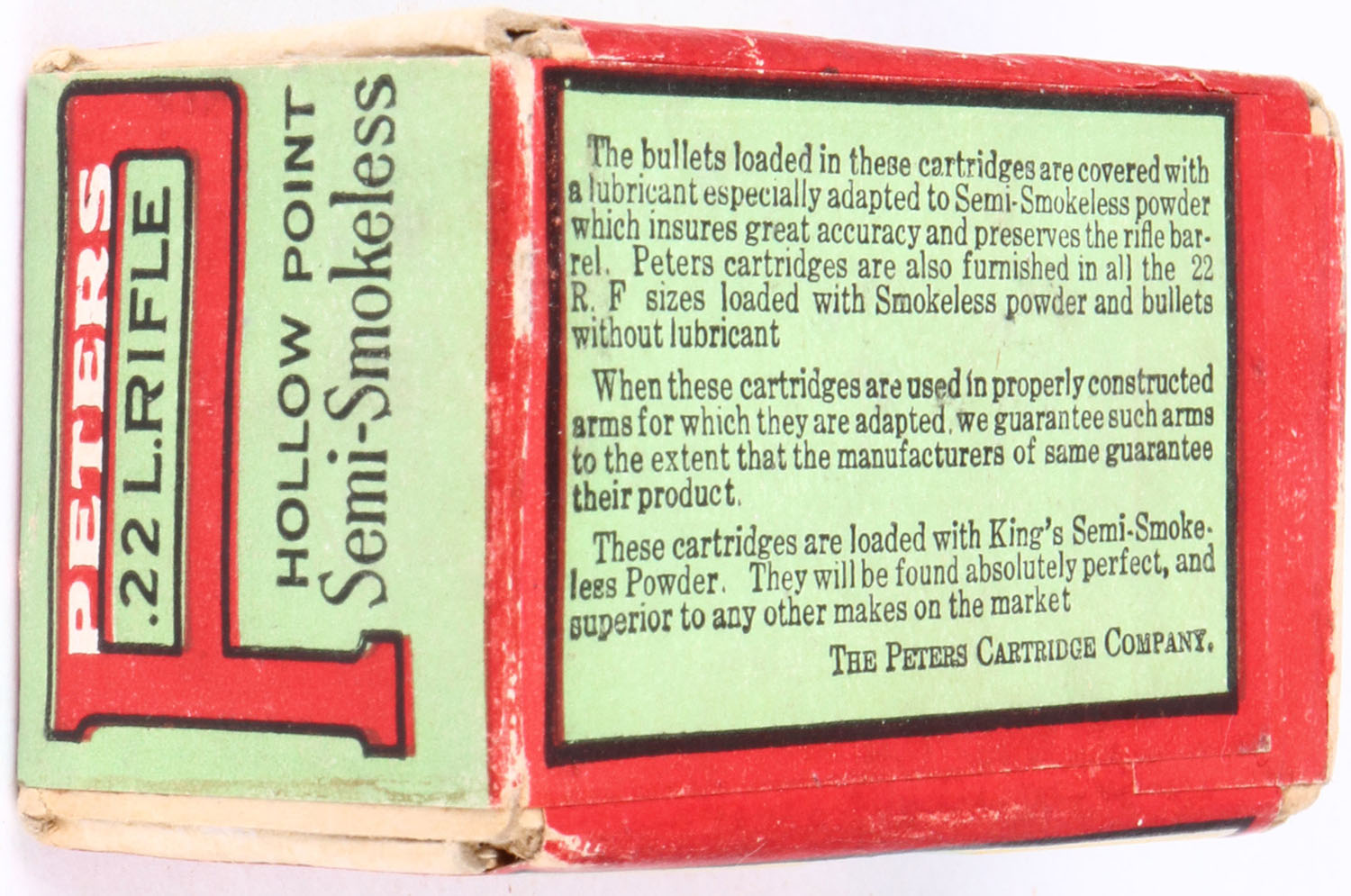 Peters, .22 Long Rifle Hollow Point, Semi-Smokeless Powder, RHWeb: PCC-5A LR-4, FULL & SEALED, 2pc. Buff box with green & red full wraparound label, box is solid with excellent color, very minor shelf & edge wear, minor corner wear, label is intact. Grade: Excellent + - Value: 100 to 400