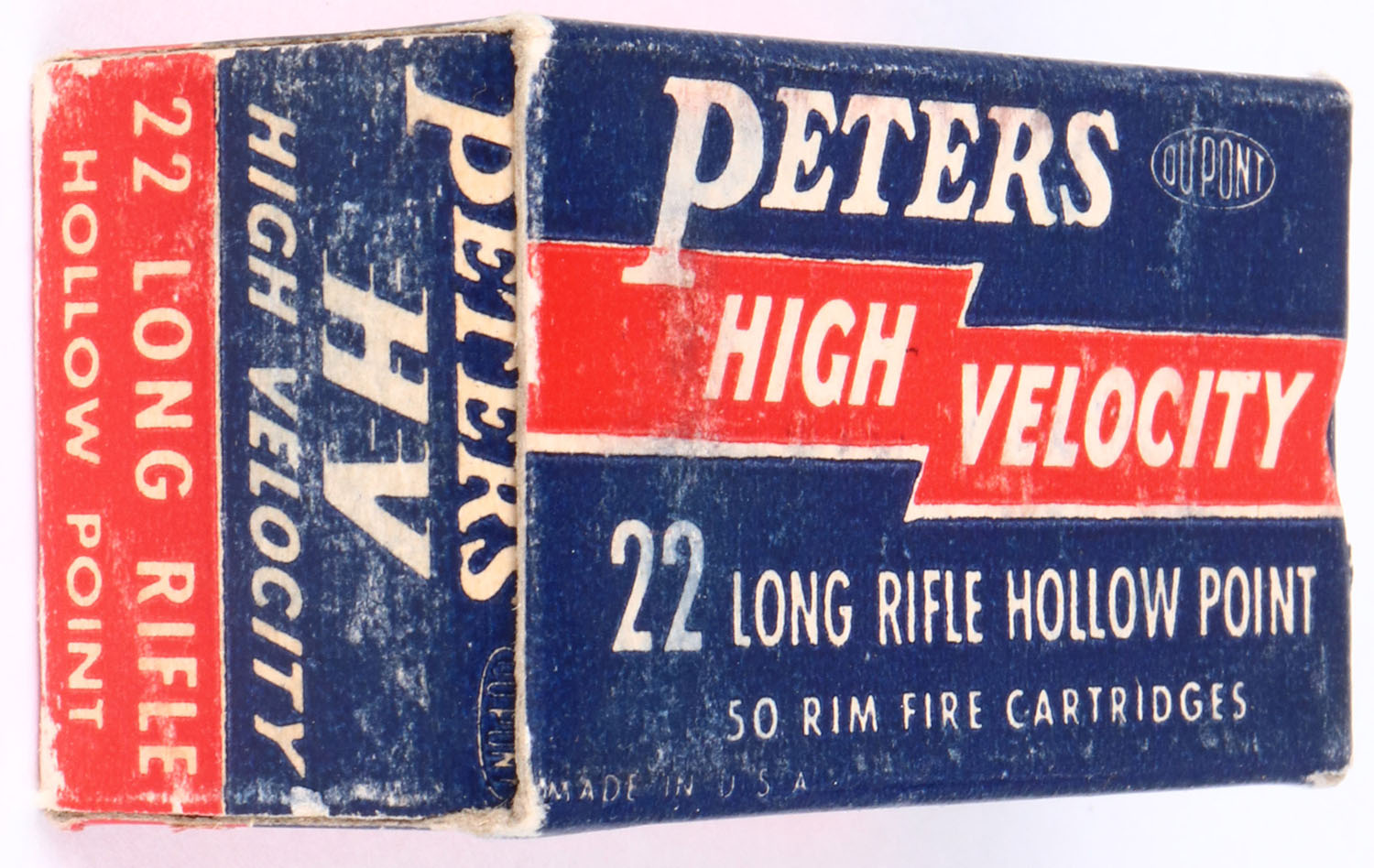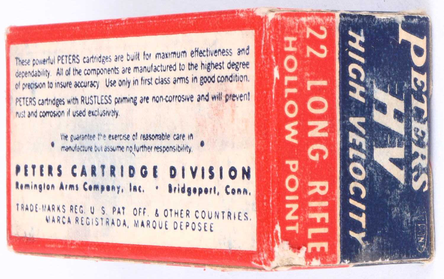 Peters, High Velocity, .22 Long Rifle Hollow Point, RHWeb: PCC-17 LR-3f, Full, 1pc. Blue red & white box, box is solid with excellent color, some shelf & corner wear, edges are mostly crisp, end flaps are solid, ammo is excellent. Grade: Excellent - Value: 10 to 50