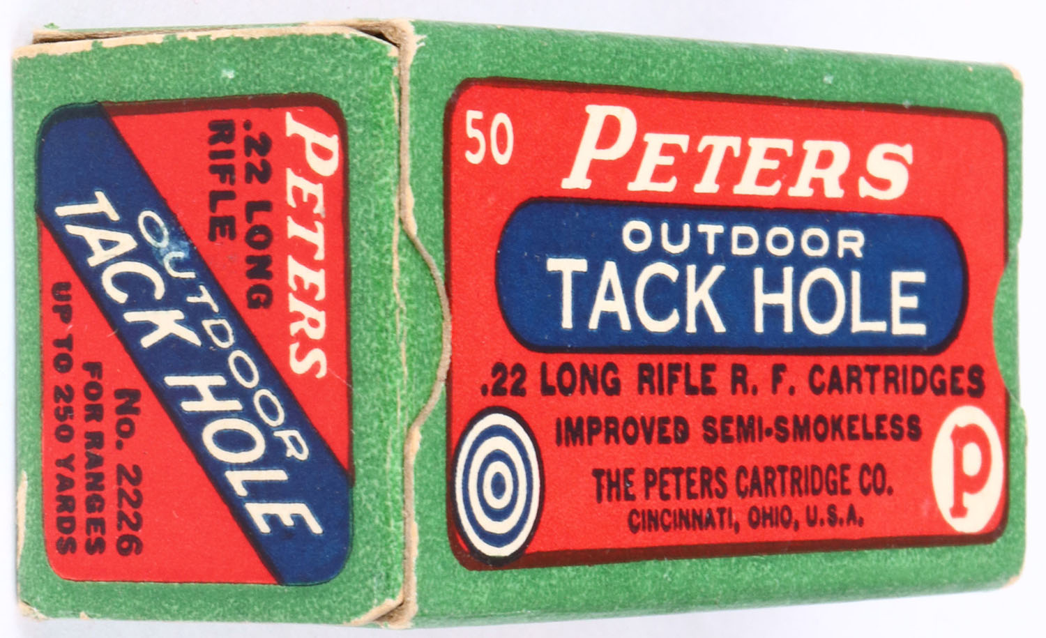 Peters, Outdoor Tack Hole, .22 Long Rifle, Improved Semi-Smokeless, RHWeb: PCC-52 LR-9, Full, 1pc. Red green & blue box, box is solid with excellent to minty color, very minor edge & corner wear, end flaps are solid, ammo is very good. Grade: Excellent ++ - Value: 100 to 200