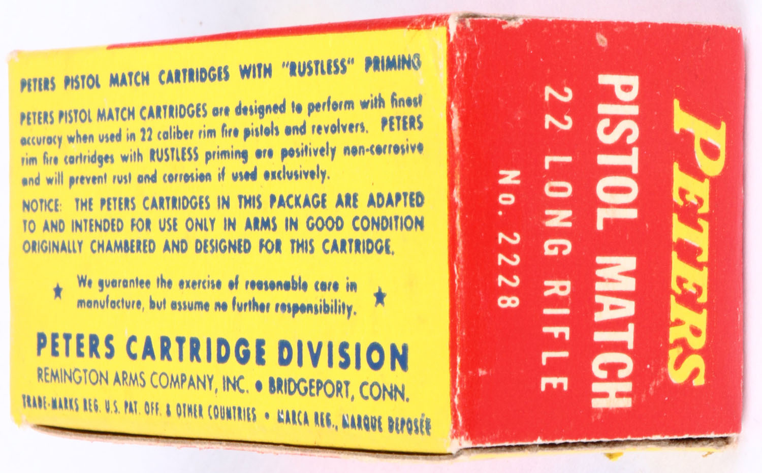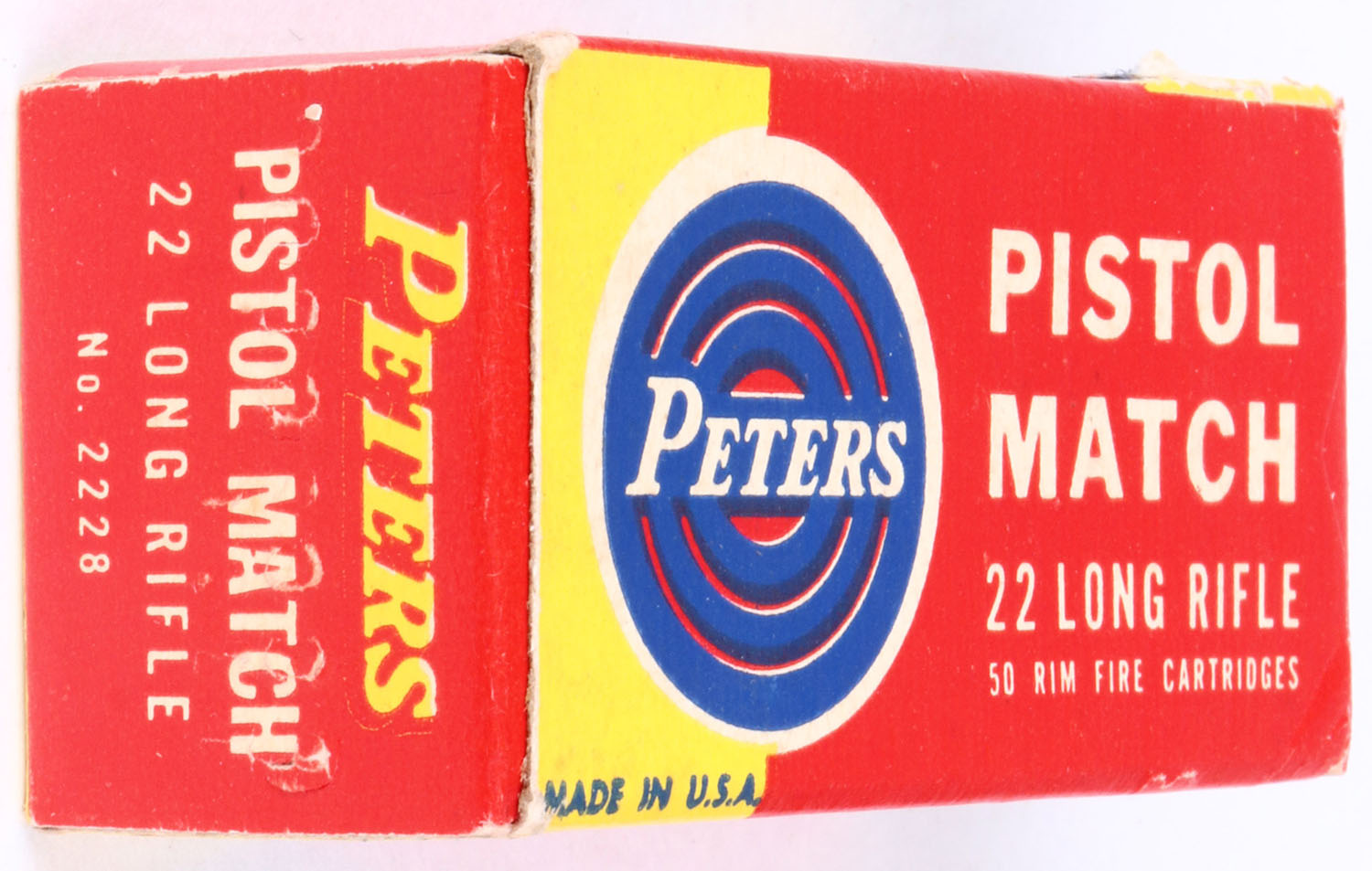 Peters, Pistol Match, .22 Long Rifle, For Use in Pistols and Revolvers Only, RHWeb: PCC-55 LR-2b, Full, 1pc. Red yellow & blue box, box is solid with excellent color, only very minor age soiling & corner wear, edges are mostly crisp, end flaps are solid, ammo is excellent. Grade: Excellent + - Value: 30 to 90
