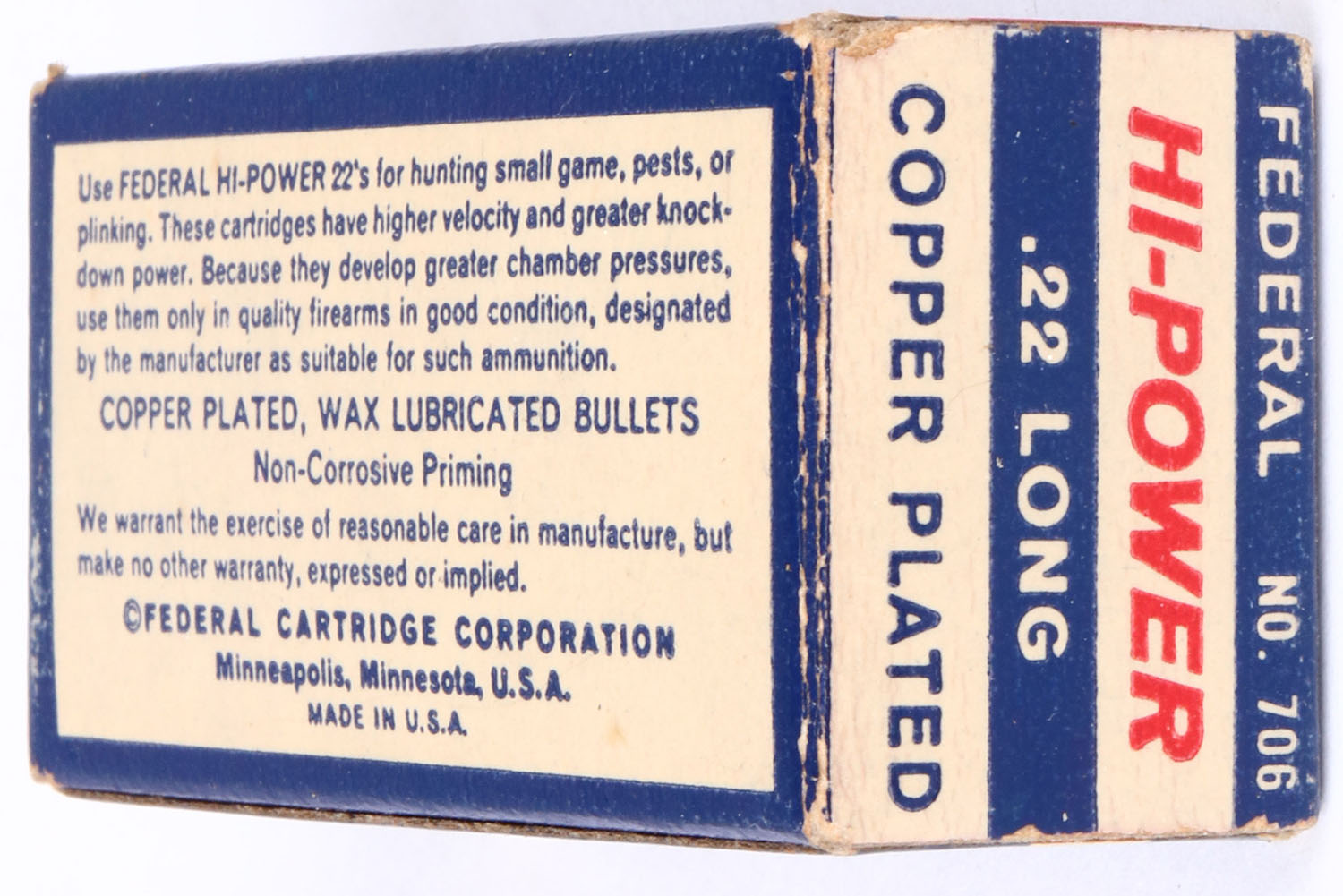 Federal, Hi-Power, .22 Long, RHWeb: FED-8 L-1, Full, 1pc. Blue white & red box, box is solid with excellent color, very minor age soiling & corner wear, edges are crisp, end flaps are solid, ammo is excellent. Grade: Excellent + - Value: 10 to 50