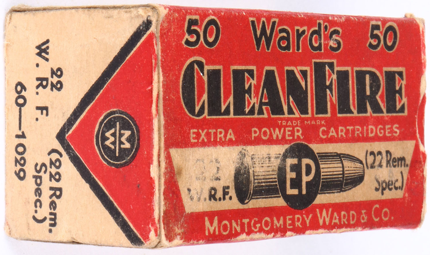 Wards, CleanFire, .22 W.R.F., Extra Power, RHWeb: MW-3D WRF-4b, Partial 35rds., 1pc. Red white & black box, box is solid with very good color, age soiling, some shelf wear, minor edge & corner wear, end flaps are solid, ammo is very good. Grade: Very Good ++ - Value: 10 to 100