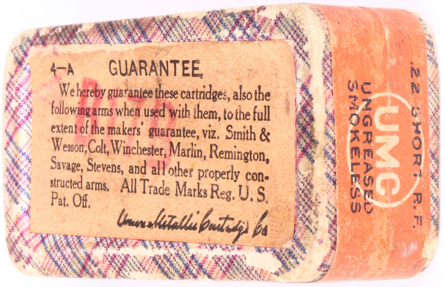 UMC, Rim Fire Cartridges, .22 Short, Smokeless Ungreased, RHWeb: UMC-9.5 S-6, FULL & SEALED, 2pc. Purple fabric box with orange top & side sealing labels, box is solid with very good to excellent color, some age soiling & shelf wear, some edge & corner wear, labels are intact. Grade: Excellent - Value: 50 to 150