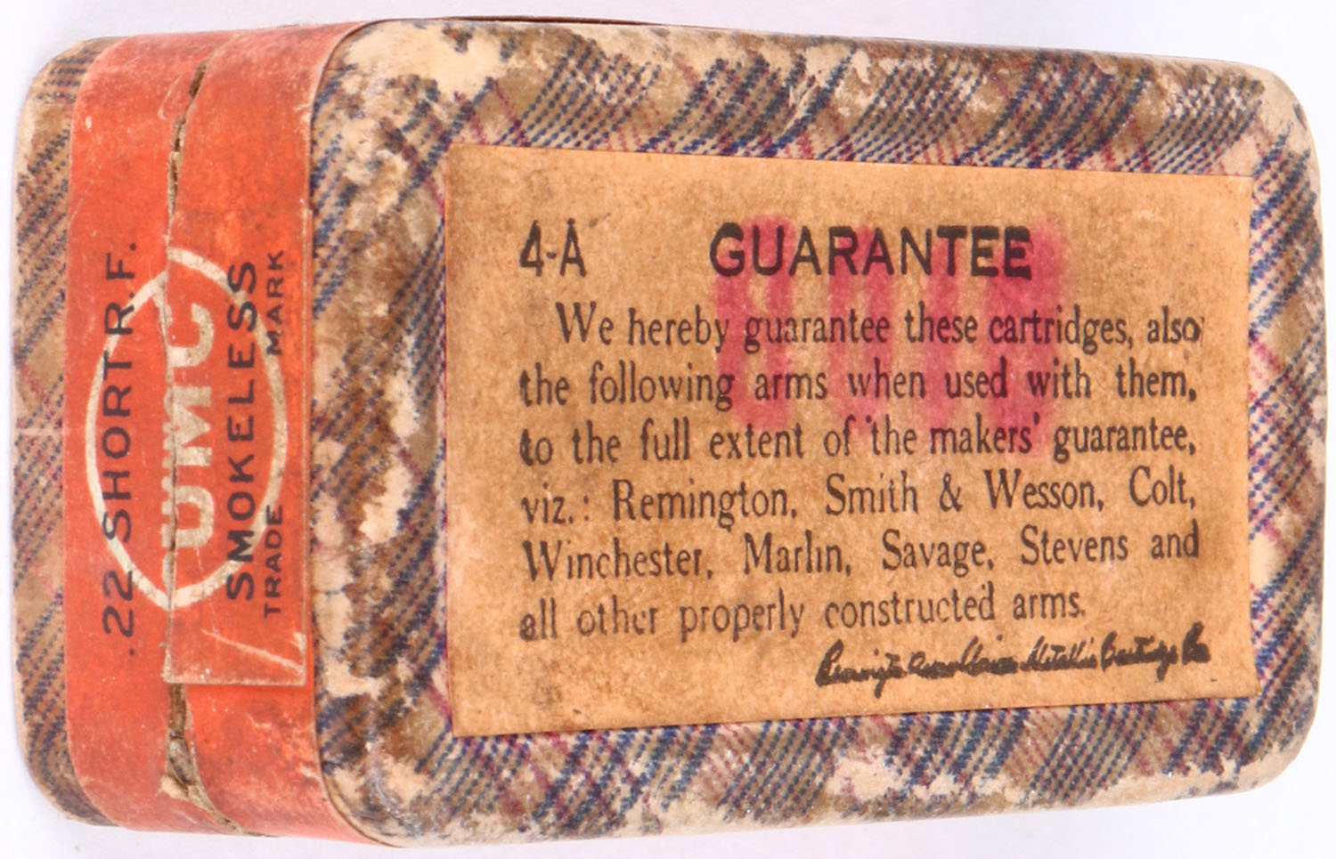 REM-UMC, .22 Short, Smokeless Ungreased, RHWeb: REM-1 S-4A, Full, 1pc. Purple fabric box with orange top & side sealing labels, box is solid with very good to excellent color, minor age soiling, shelf wear, very minor edge & corner wear, some peeling to side sealing label on left end, labels are intact, ammo is fair to good. Grade: Excellent - Value: 40 to 200