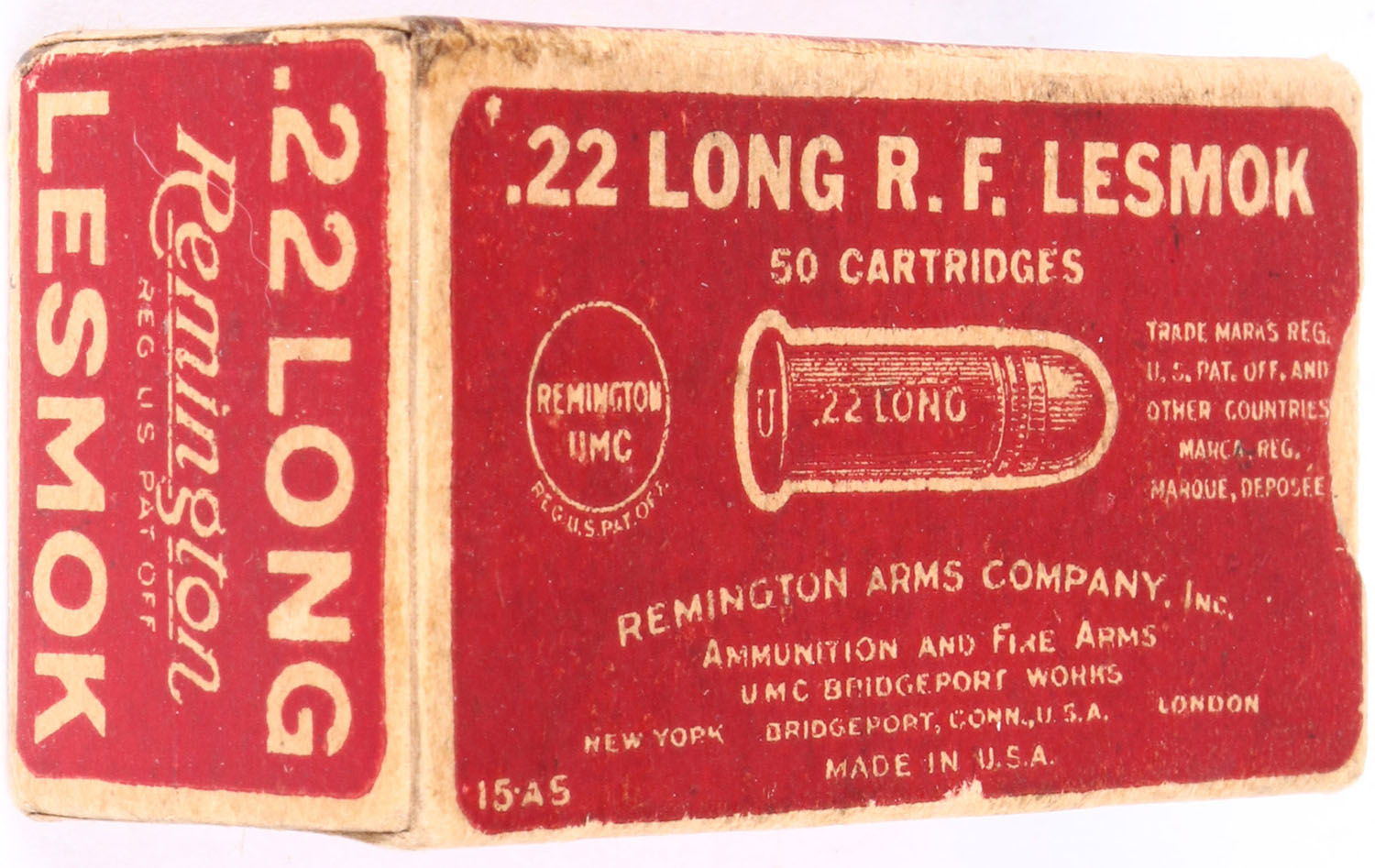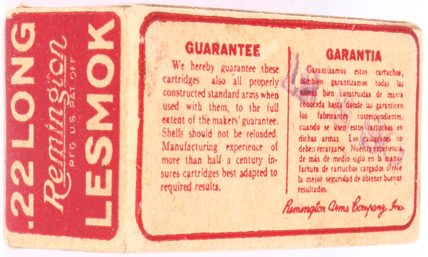 REM-UMC, .22 Long, Lesmok, RHWeb: REM-6 L-2C, Full, 1pc. Red & buff box, box is solid with excellent color, minor age soiling, very minor corner wear, edges are mostly crisp, end flaps are solid, ammo is very good. Grade: Excellent - Value: 20 to 60