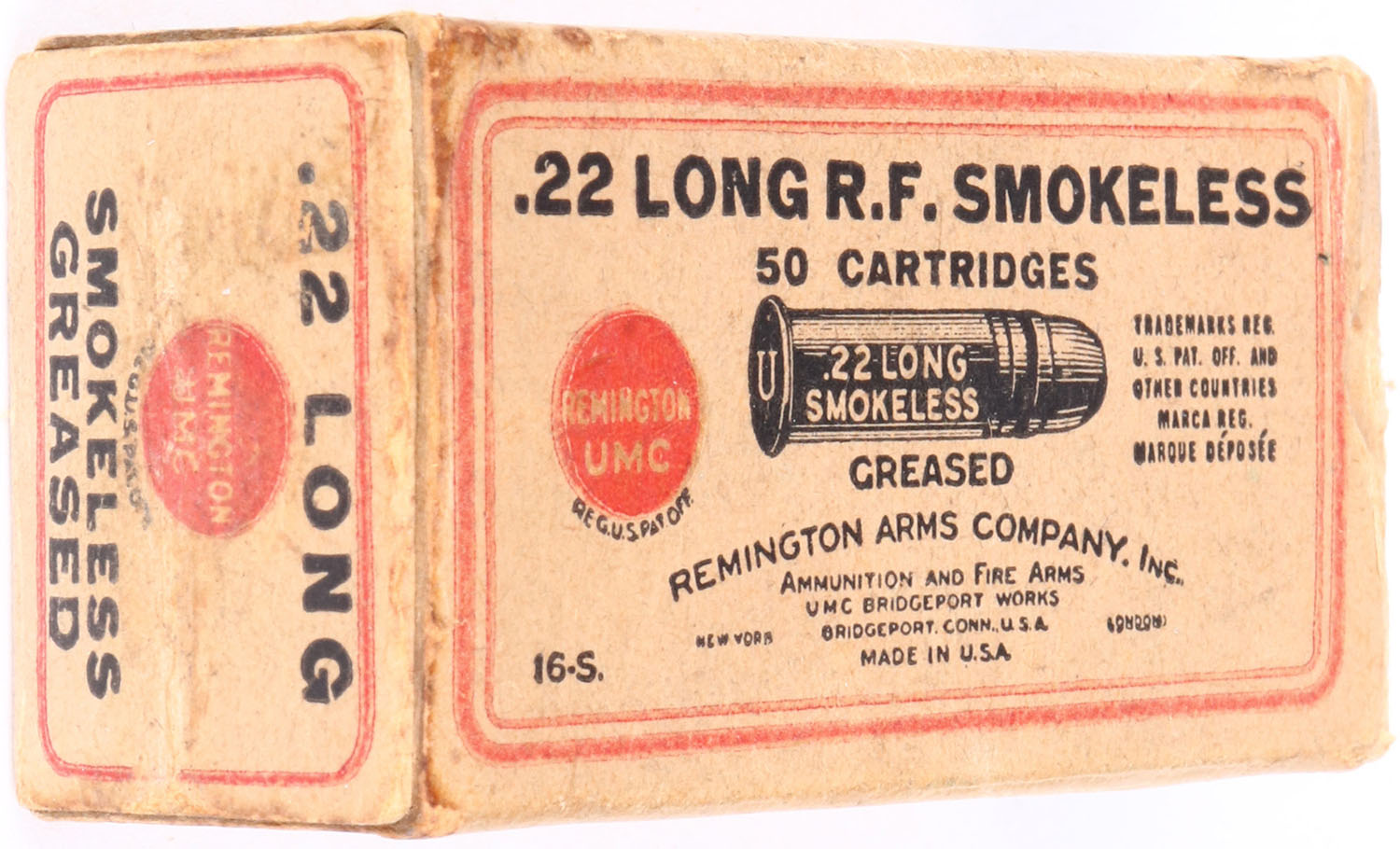 REM-UMC, .22 Long, Smokeless Greased, RHWeb: REM-6 L-6, Full, 1pc. Buff black & red box, box is solid with excellent color, very minor age soiling, minor corner wear, very minor edge wear, end flaps are solid, ammo is very good. Grade: Excellent - Value: 10 to 50
