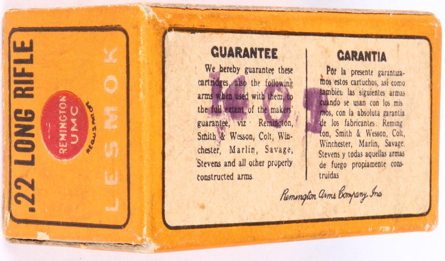 REM-UMC, .22 Long Rifle, Lesmok, RHWeb: REM-6 LR-1, Full, 1pc. Orange black & red box, box is solid with excellent color, minor age soiling, very minor corner wear, edges are crisp, end flaps are solid, ammo is very good to excellent. Grade: Excellent + - Value: 20 to 60