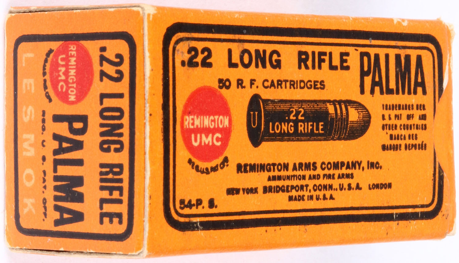 REM-UMC, Palma, .22 Long Rifle, Lesmok, RHWeb: REM-52 LR-1b, Full, 1pc. Orange black & red box, box is solid with excellent to minty color, only very minor age soiling on bottom and very minor corner wear, edges are crisp, end flaps are solid, ammo is excellent. Grade: Excellent ++ - Value: 20 to 60
